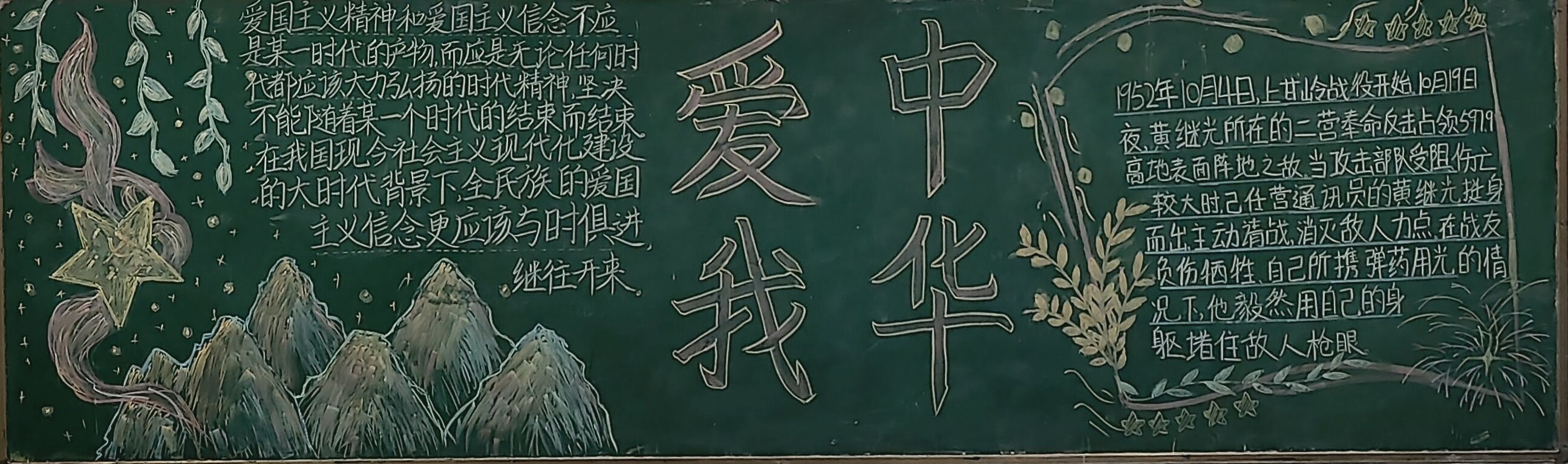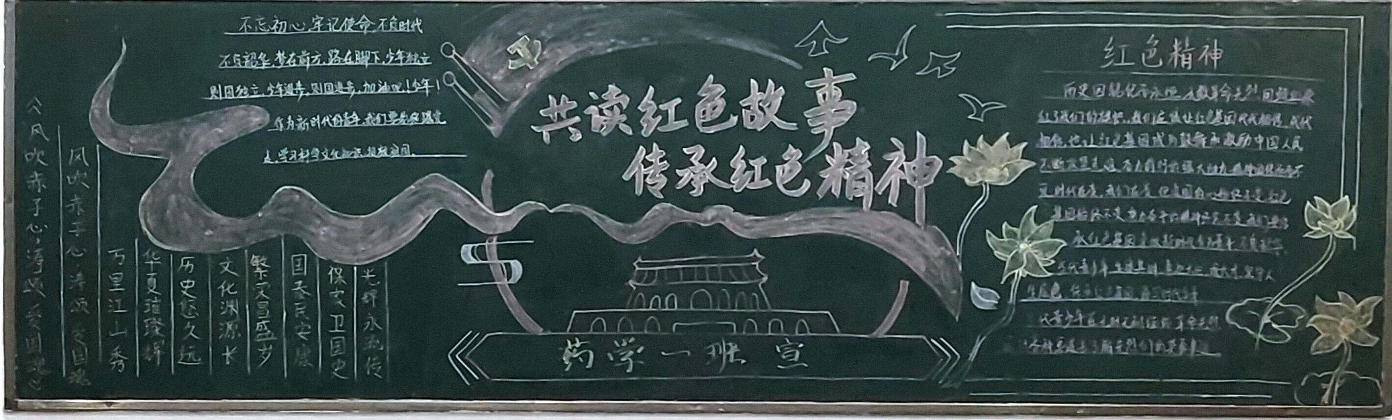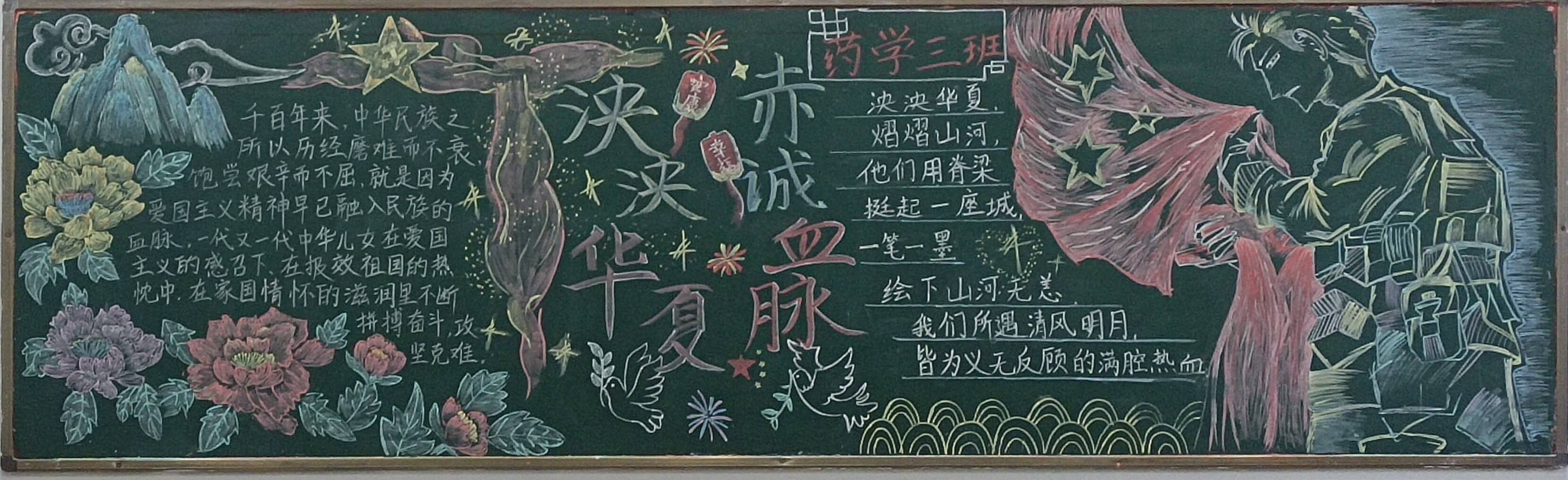 各班级积极参与主题板报活动,将对国家的热爱展现在板报中。围绕《中华人民共和国爱国主义教育法》的内容进行设计,所结合的场景有祥云、和平鸽、红色旗帜、牡丹花等来突出爱国思想。千秋华夏,壮丽河山,落日余晖,璀璨星河;麦穗代表粮食,暗示祖国繁荣富强,红旗飘扬寓意青年敢闯敢拼,白鸽象征和平和飞向更高远蓝天的愿景;图文并茂用中国五星红旗、北京天安门融入宣传爱国主义内容。