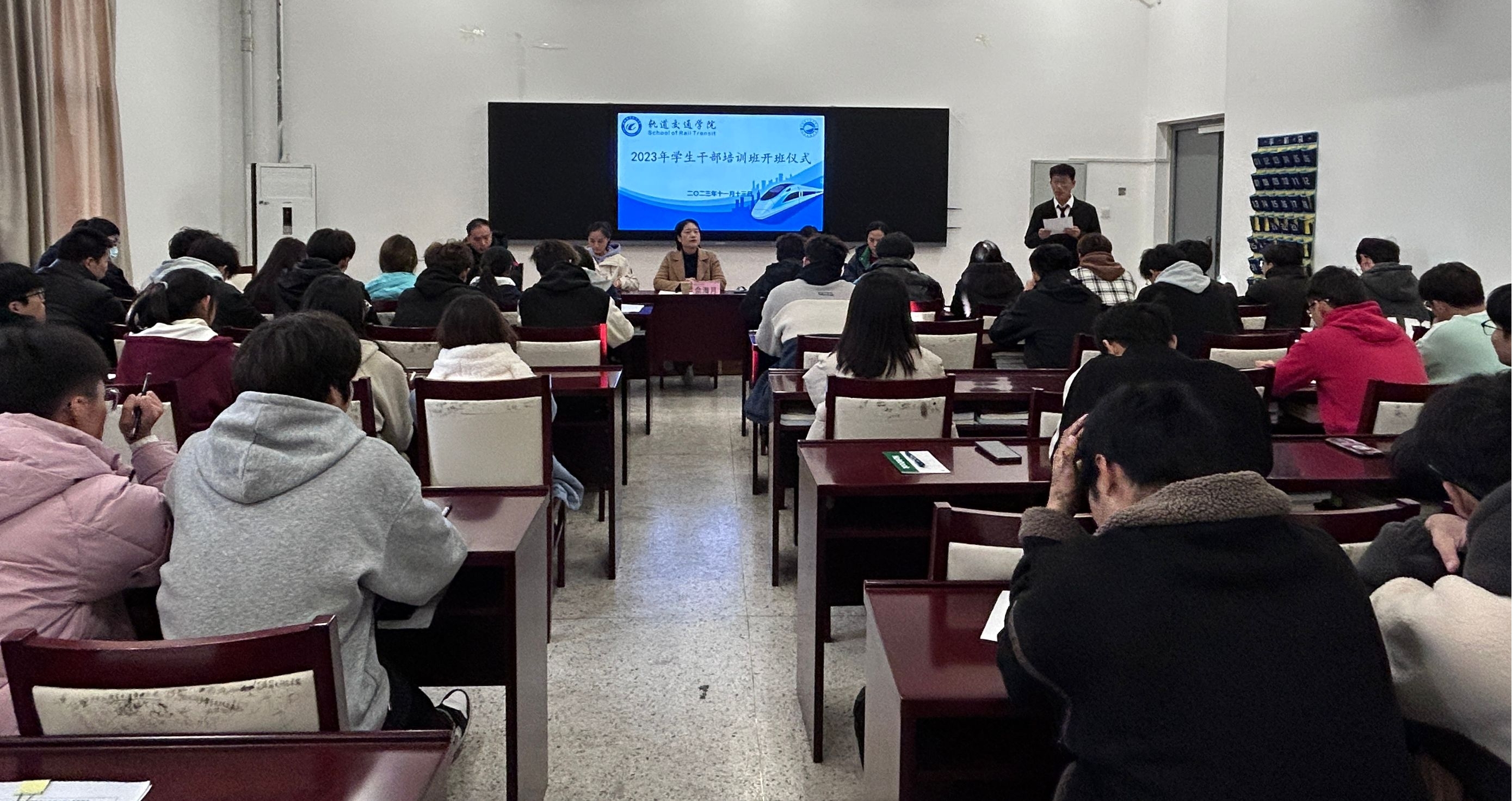 为进一步提高学生组织队伍整体素质,充分发挥学生干部在大学生思想政治教育中的桥梁和纽带作用,加强学生干部的岗位意识、责任感和团队协作能力,进一步推动学校学风建设和学生组织队伍建设,11月13日,轨道交通学院团总支举办在轨道楼309进行学生干部培训班开班仪式暨第一次课。轨道交通学院党总支书记佘海月、副书记梁雯婷,全体辅导员及学生干部培训班全体人员参会。