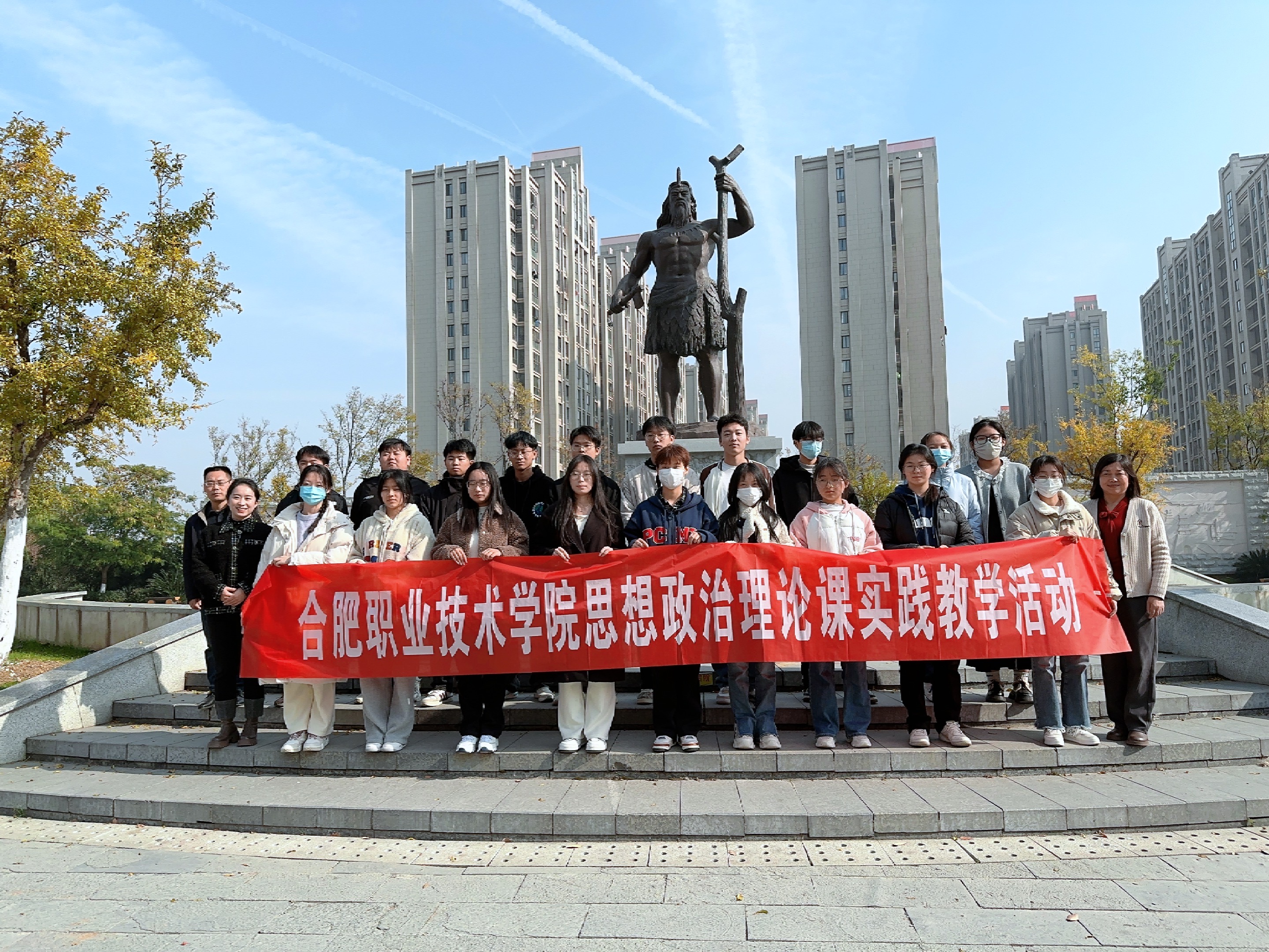 本次实践活动将思政小课堂与社会大课堂有机结合起来,立足地方文化、本土文化,带领学生学习参观“有巢氏”文化广场。广场以“有巢氏” 为主题,紧紧围绕“构木为巢”的理念,采用“敬巢”“礼巢”“颂巢”三个方面进行诠释。其中主体雕塑把内在的品质通过对人物造型的雕琢进行展示:有巢氏右手紧握石斧,左手拿着砍下的树枝,昂首站立,目眺远方,寓意摆脱蒙昧,主动自觉的改造自然,开启文明的端头。头戴羽饰,颈佩兽牙,身着树叶,既是远古时代的印记,也是先民夏居巢,冬居穴的历史面貌。