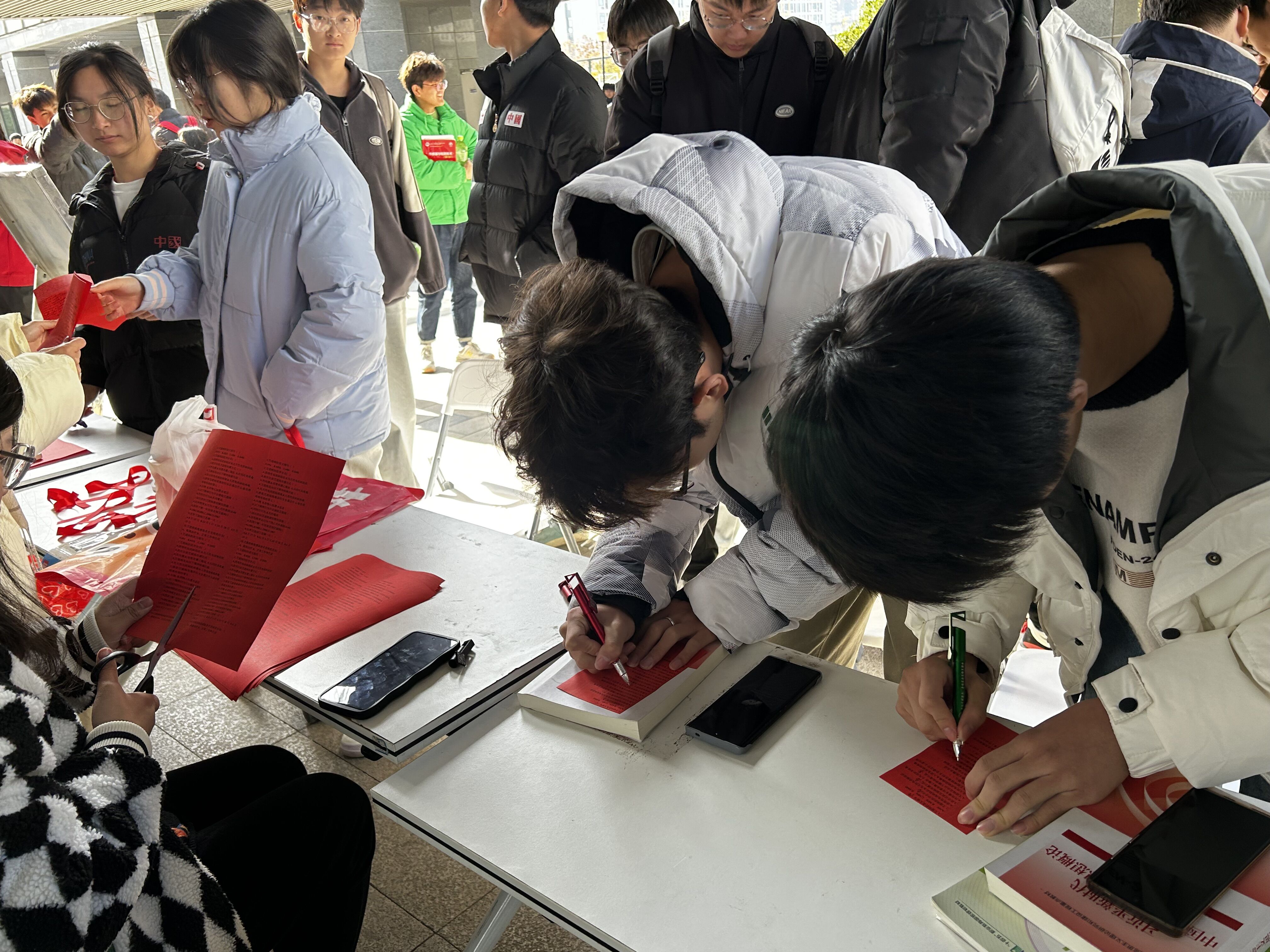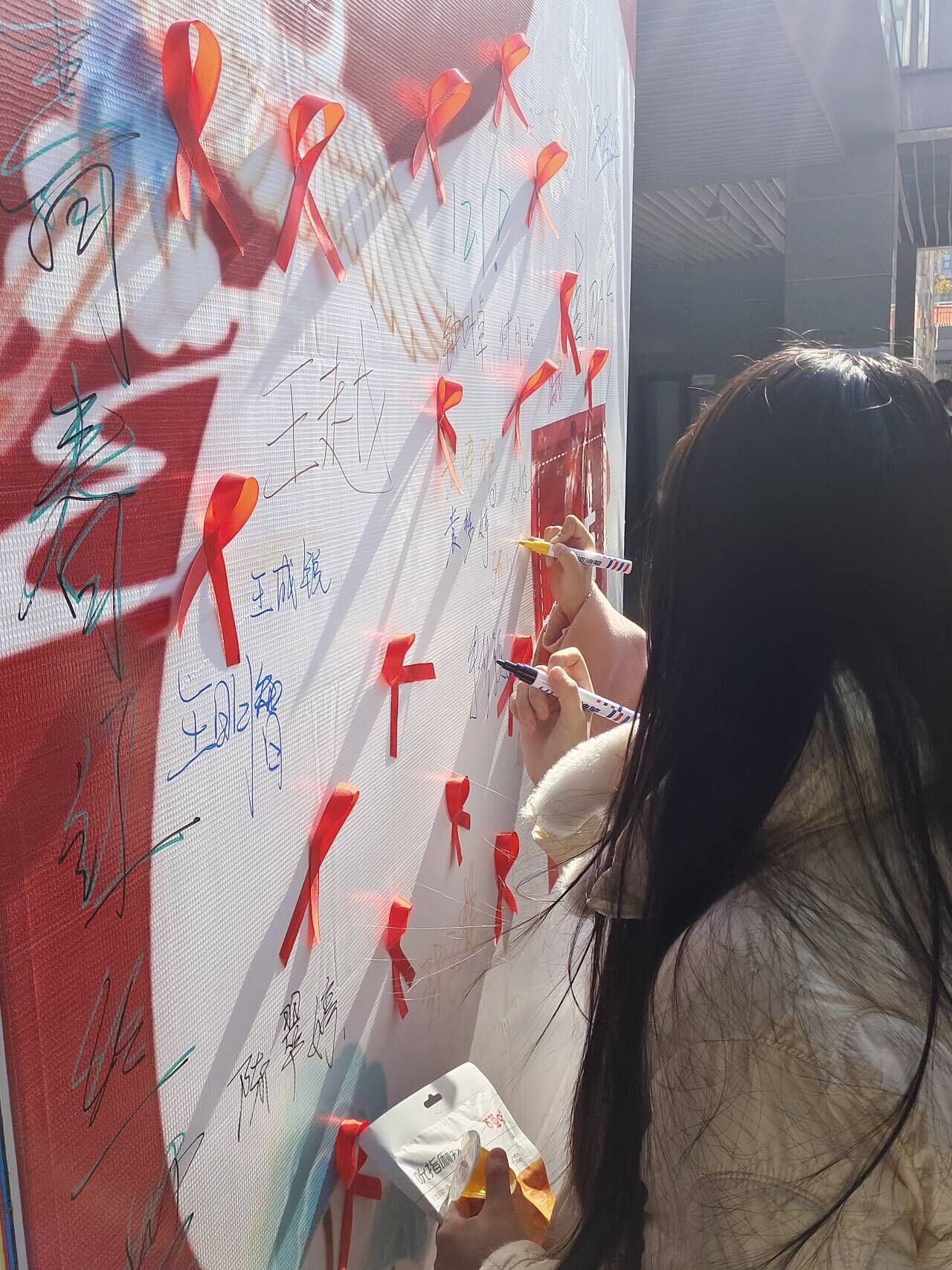 本次活动主要包括制作红丝带、防艾知识问答、手写防艾签名等环节。在现场志愿者的指导下,同学们自制红丝带,粘贴在“青春防艾”宣传板上并签上自己的名字。防艾知识问答环节中,现场气氛热烈,参与者兴致满满,抽取问题限时答题,答对题即可参与套圈游戏,寓教于乐,让大家在快乐的氛围中增强了防艾知识记忆。