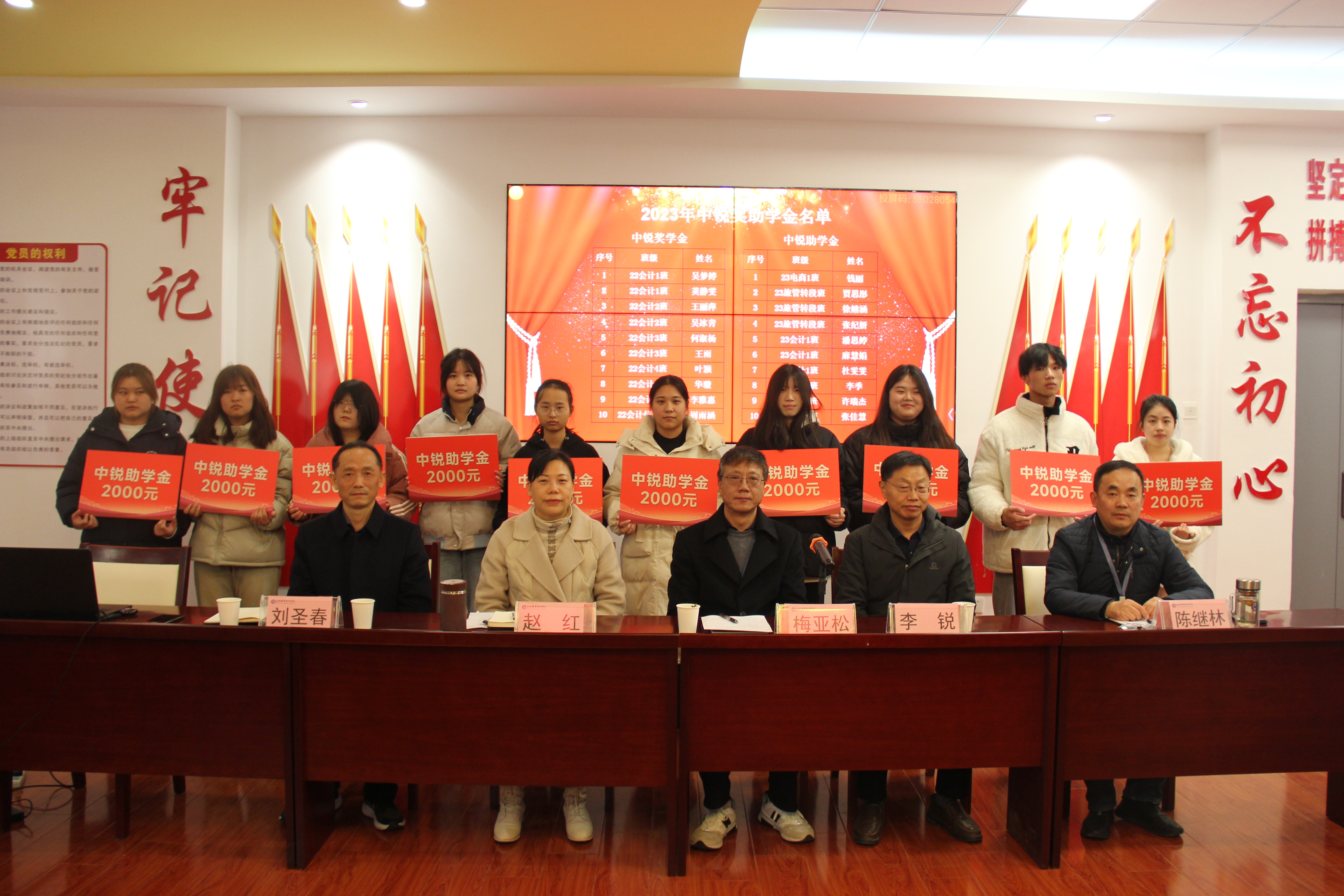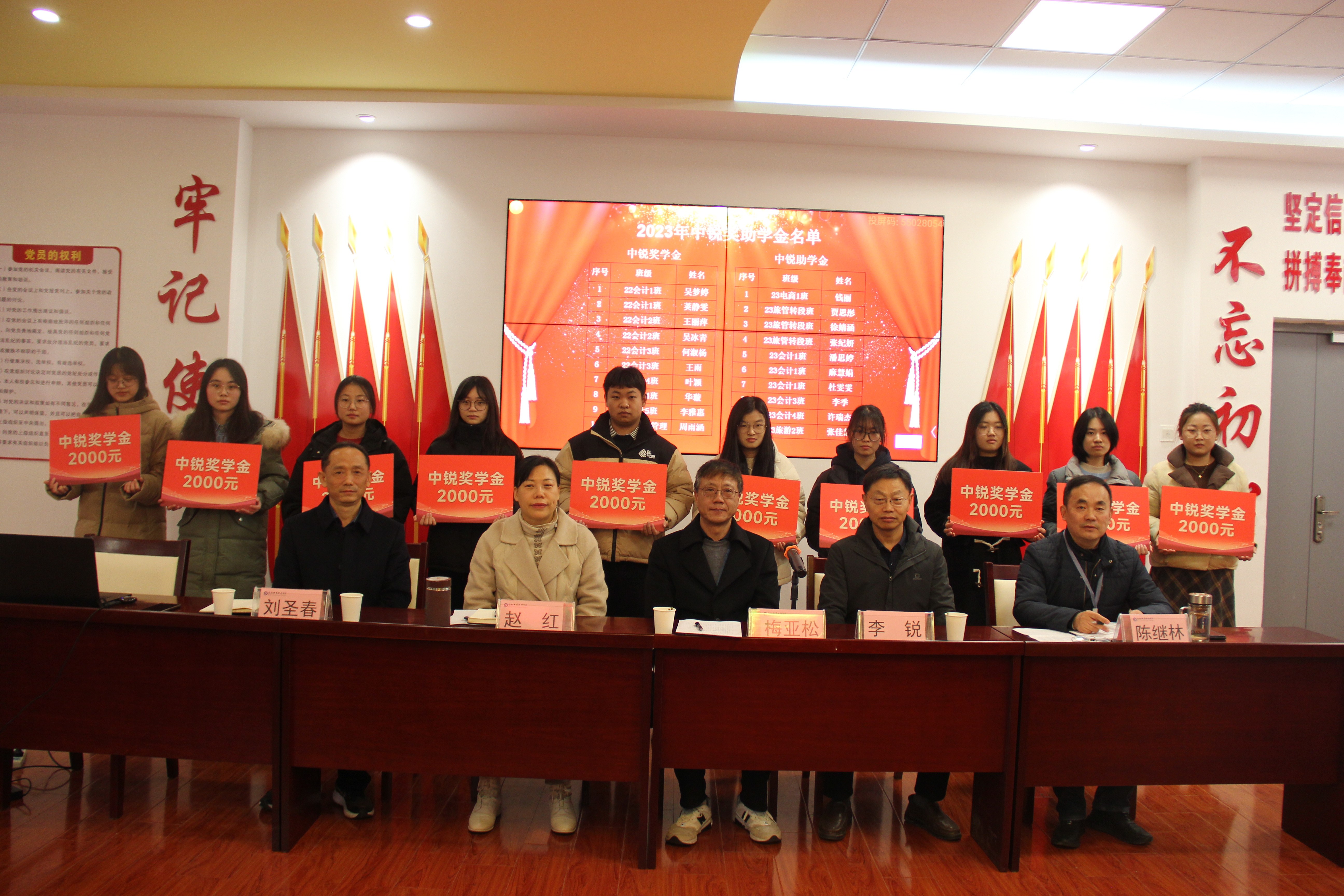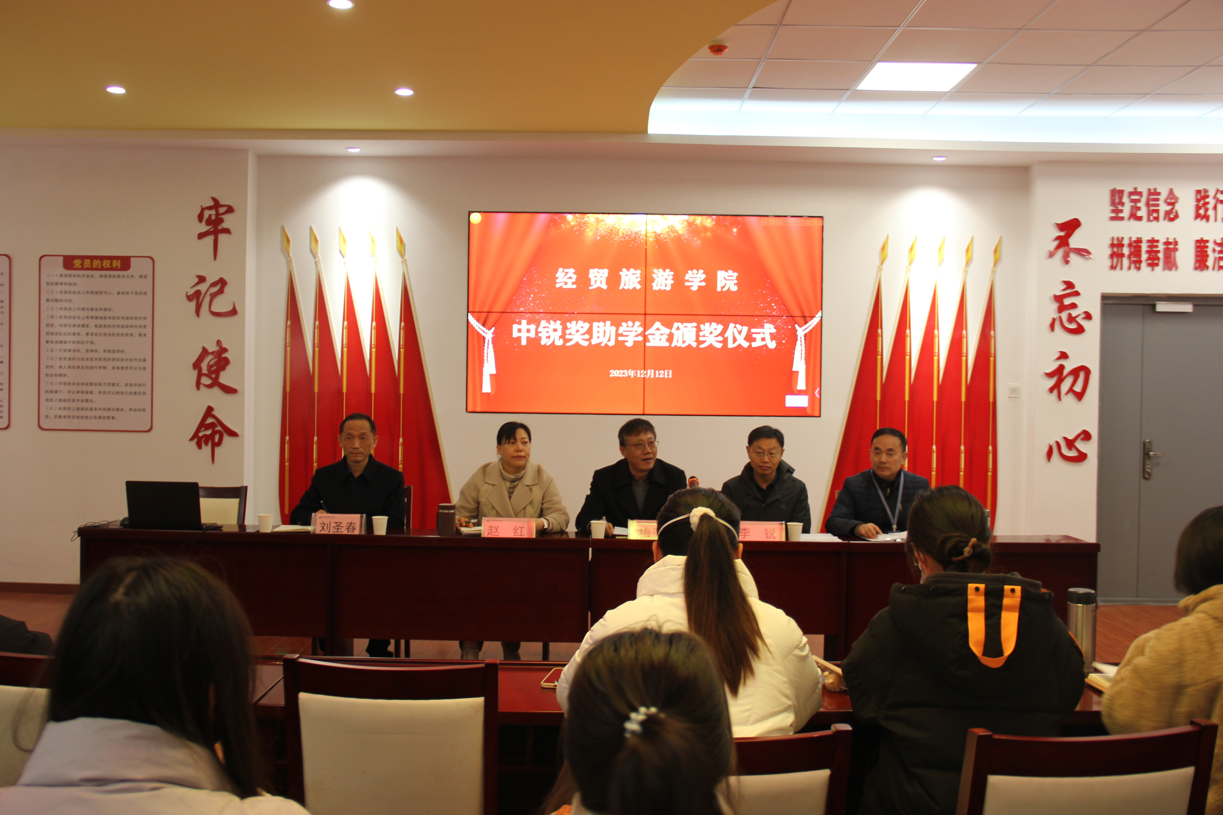 12月12日下午,经贸旅游学院在学院三楼党性体验馆举行2023年“中锐”奖助学金颁奖仪式。安徽中锐税务师事务所有限责任公司董事长李锐、学院党政领导班子、学院学管办全体辅导员、全体获奖学生和部分学生代表参加了此次颁奖仪式。颁奖仪式由学院党总支书记梅亚松主持。