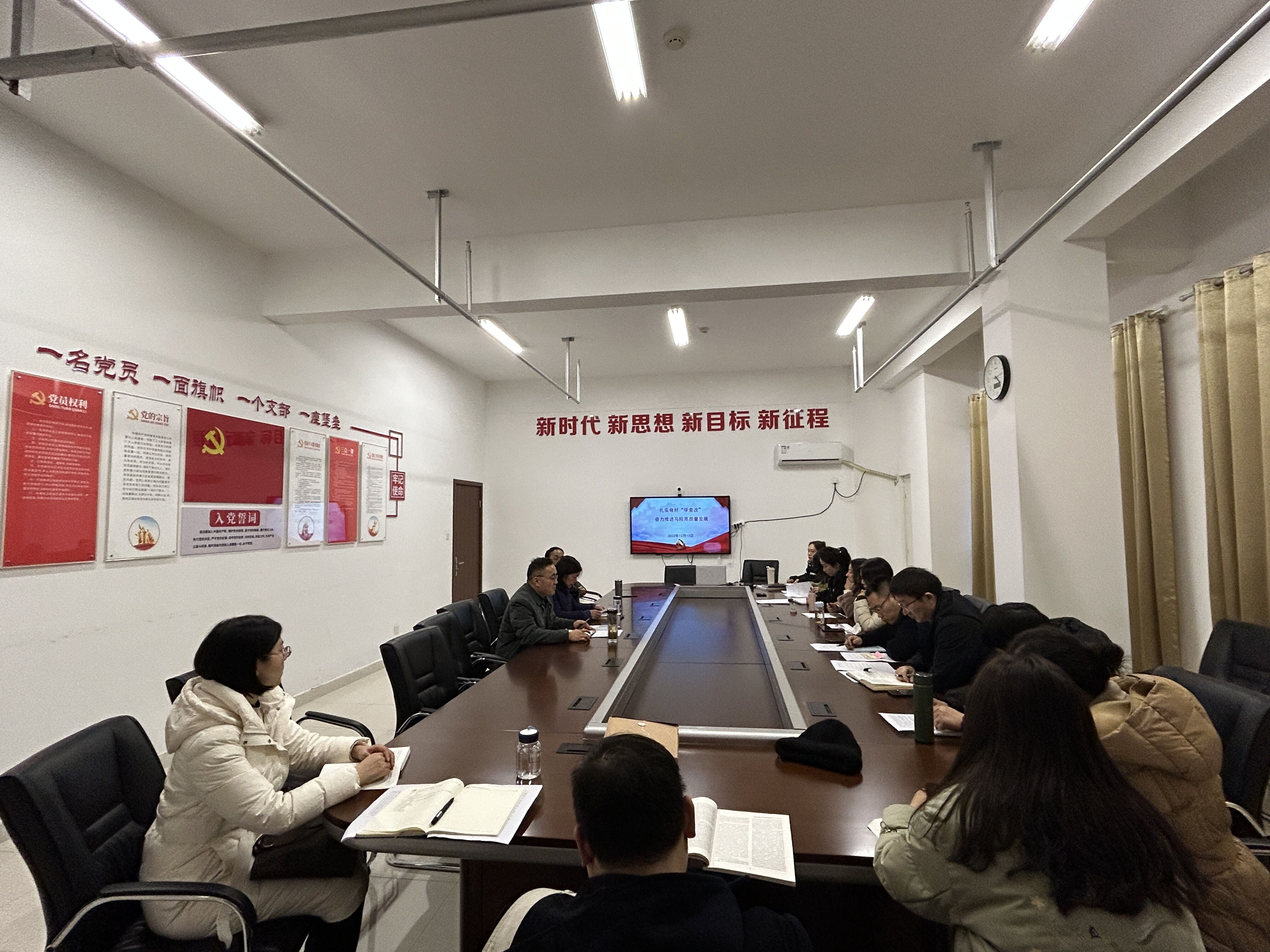 为在学思践悟中推动学习贯彻习近平新时代中国特色社会主义思想主题教育走深走实,增强推动学院事业高质量发展本领、服务群众本领、防范化解风险本领,12月13日下午,马克思主义学院党支部开展十二月份主题党日暨书记讲党课活动,学院党支部书记王文飞、院长靳玉琼和全体党员教职工参加了会议,会议由王文飞主持。