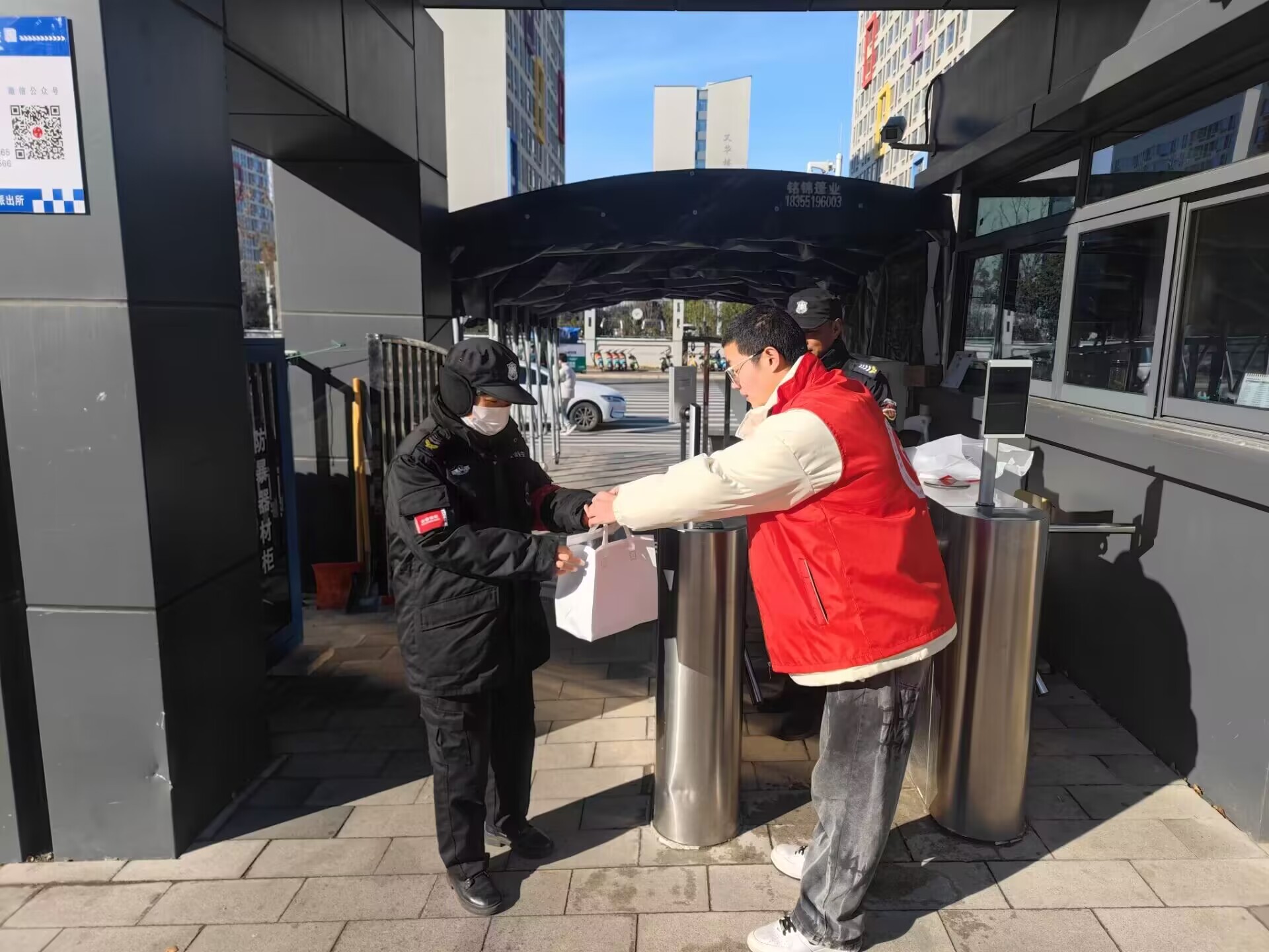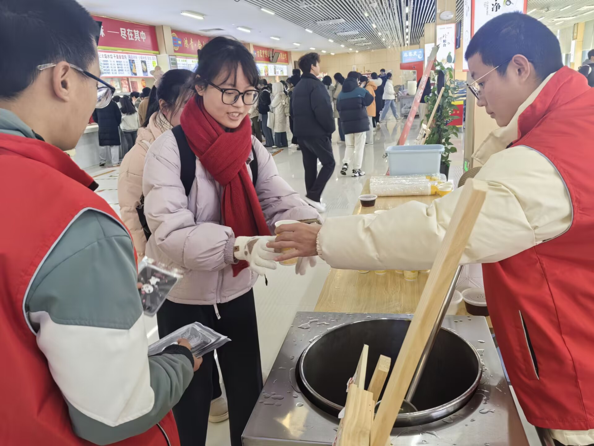 一大早,志愿者们和食堂工作人员一早就忙碌起来,洗姜、切姜、煮茶、熬制,只为在寒冷的冬日为大家送上一份温暖。一切准备就绪,红色的身影随之开始忙碌。志愿者们分工协作,有的负责盛放姜汤,将热气腾腾的纸杯送到大家手中,有的则分发暖宝宝并积极维护现场秩序,确保每一位前来的同学和教职工都能够品尝到杯中的暖意。“您好,请喝一杯热姜汤,暖暖身子吧。”“天气寒冷,一定要注意保暖啊。”一杯杯温暖的姜汤,一句句真情的问候,传递着一份份暖暖的心意,大家收到姜汤后脸上洋溢的笑容也让志愿者们备受鼓舞。
