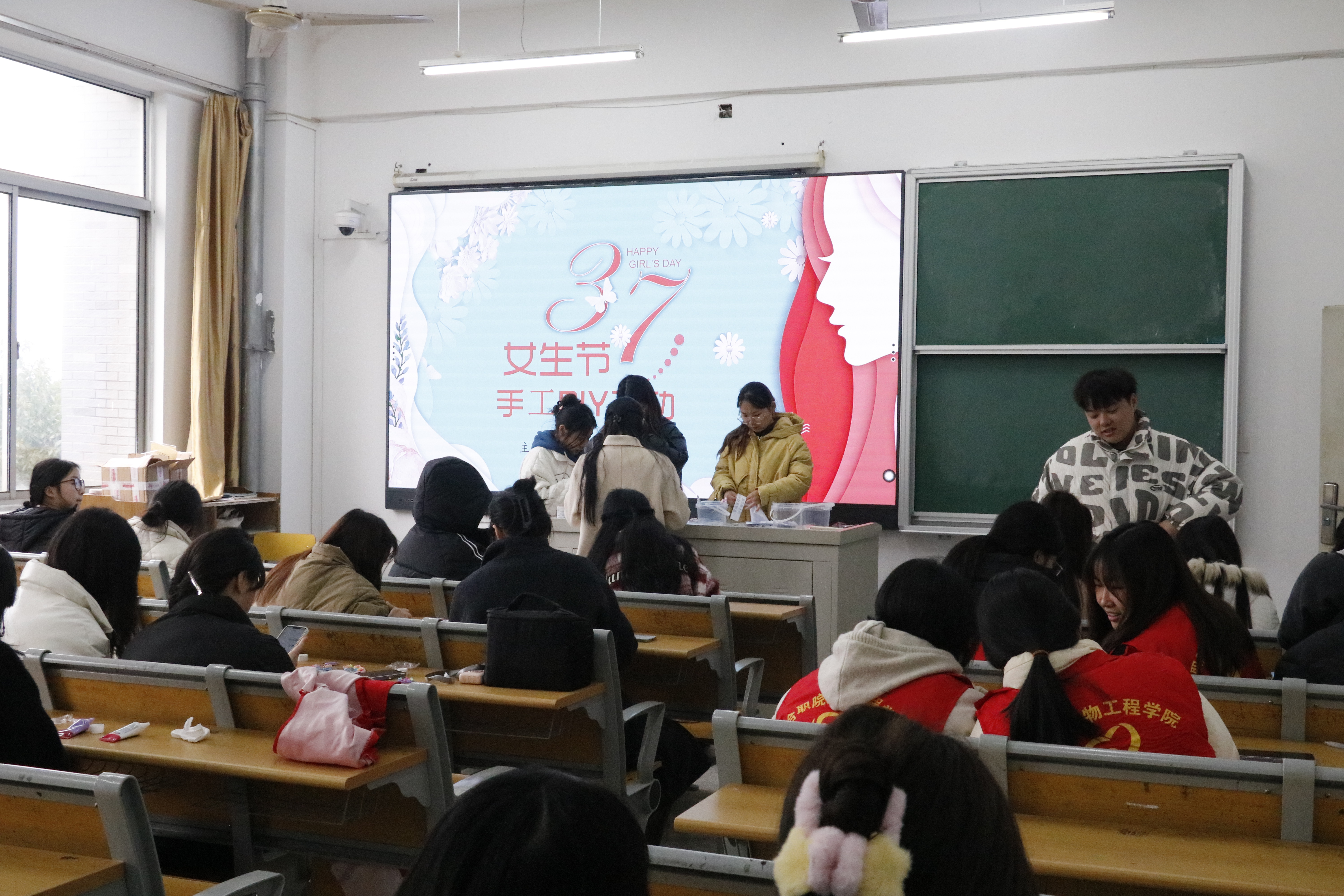 活动主要分为两个环节,第一环节是手工DIY,女生们各自挑选自己喜欢的贺卡,由志愿者带领,找到位置进行手工DIY,在志愿者们积极服务协助下,女生们制作好了精美的DIY贺卡和发夹并进行合影留念。第二环节是撕掉消极标签做不被定义的她,活动开始许多女生踊跃参加,因其形式新颖有趣,现场气氛十分活跃热烈,志愿者在现场热情讲解介绍活动参与流程。参与的每位女生在立牌上撕下一条定义女生的消极标签,再在便利贴上写下一句鼓励女性的暖心话贴上,即可获得一次抽奖机会,不同颜色所代表的奖励不同。在现场音乐的带动下,女生们的参与热情空前高涨,现场其乐融融。