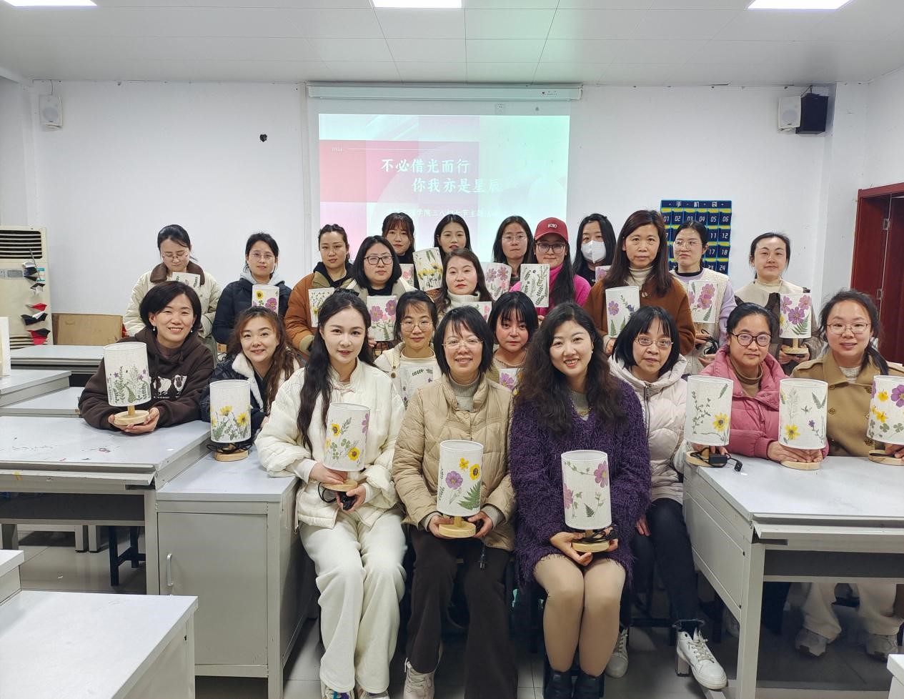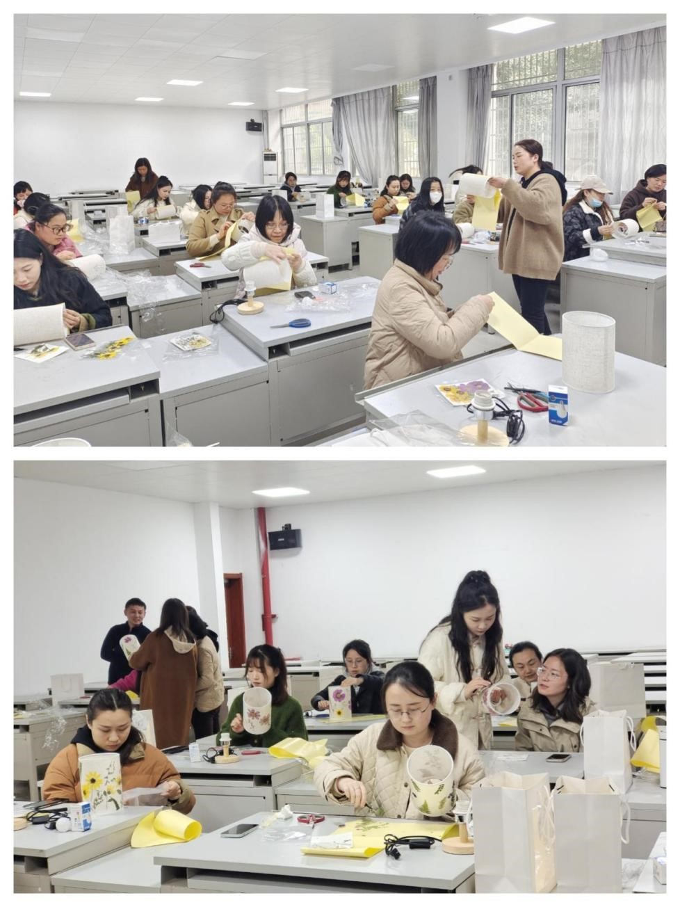 为纪念第114个“三八”国际妇女节,展现女教师风采,丰富女教师文化生活,3月13日下午,建筑工程学院全体女教师开展“不必借光而行 你我亦是星辰”三八妇女节主题活动——干花台灯DIY制作。