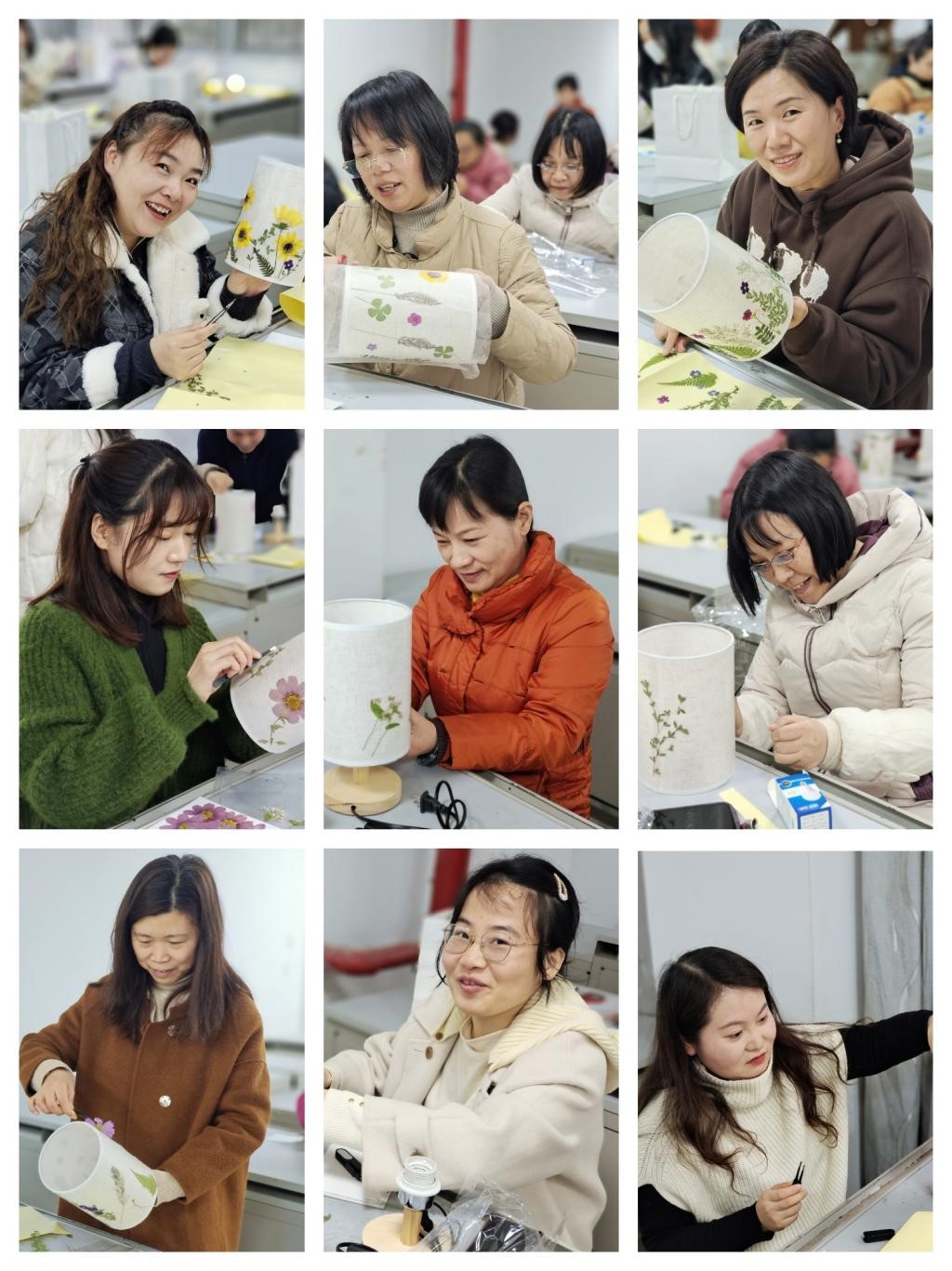 活动现场,老师详细讲解了干花台灯的设计和制作过程,大家在老师的引导下,将各自的想法表现在台灯制作中,根据自己的设计选取花材的形状、颜色、大小,并将花材黏贴、调整、固定,把做好的灯筒与灯座组装在一起。随着美好的DIY时间一点点过去,一盏盏独一无二的干花台灯也相继成形。