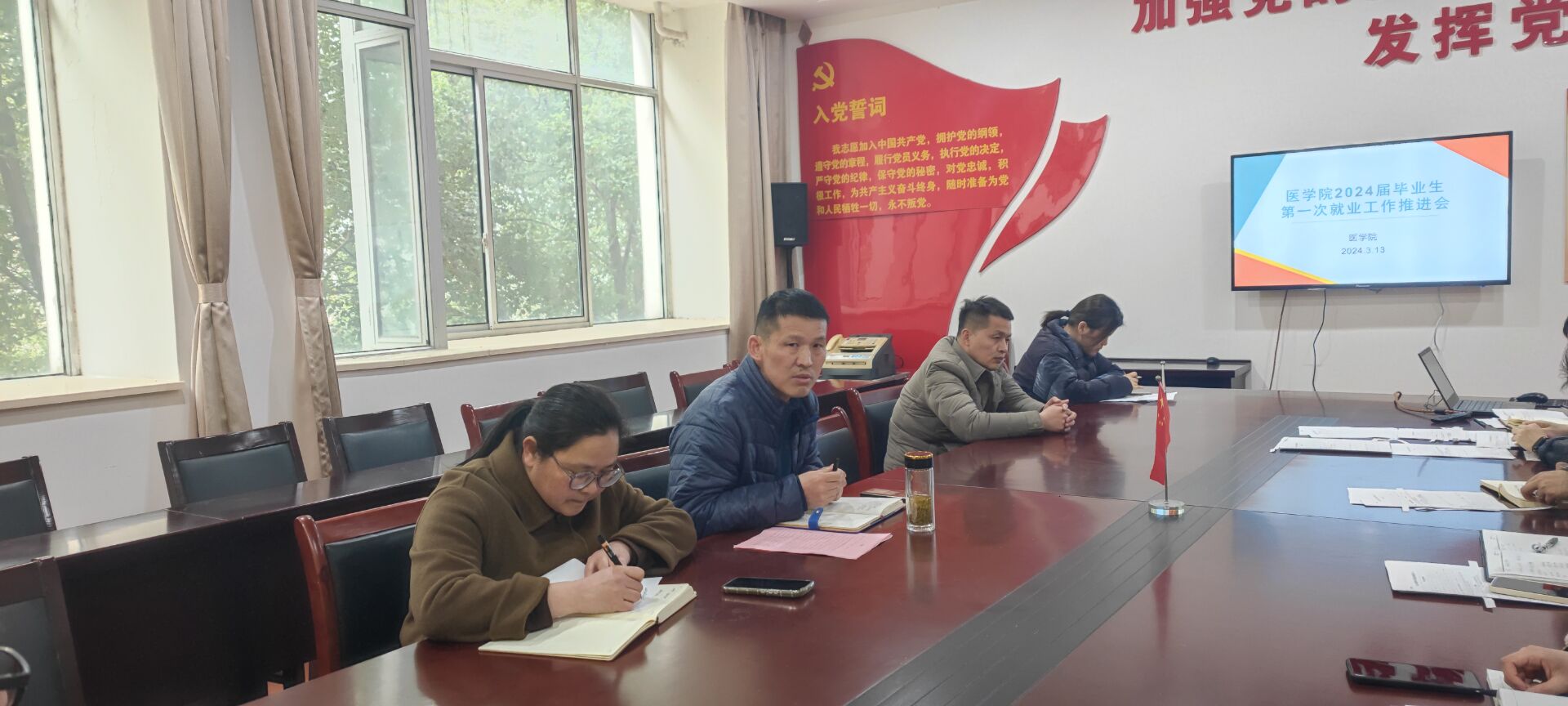3月13日下午,医学院在党员活动室召开2024届毕业生第一次就业工作推进会,医学院党总支副书记(主持工作)邹华兵、副书记梁春艳及全体2024届毕业班辅导员参加会议。