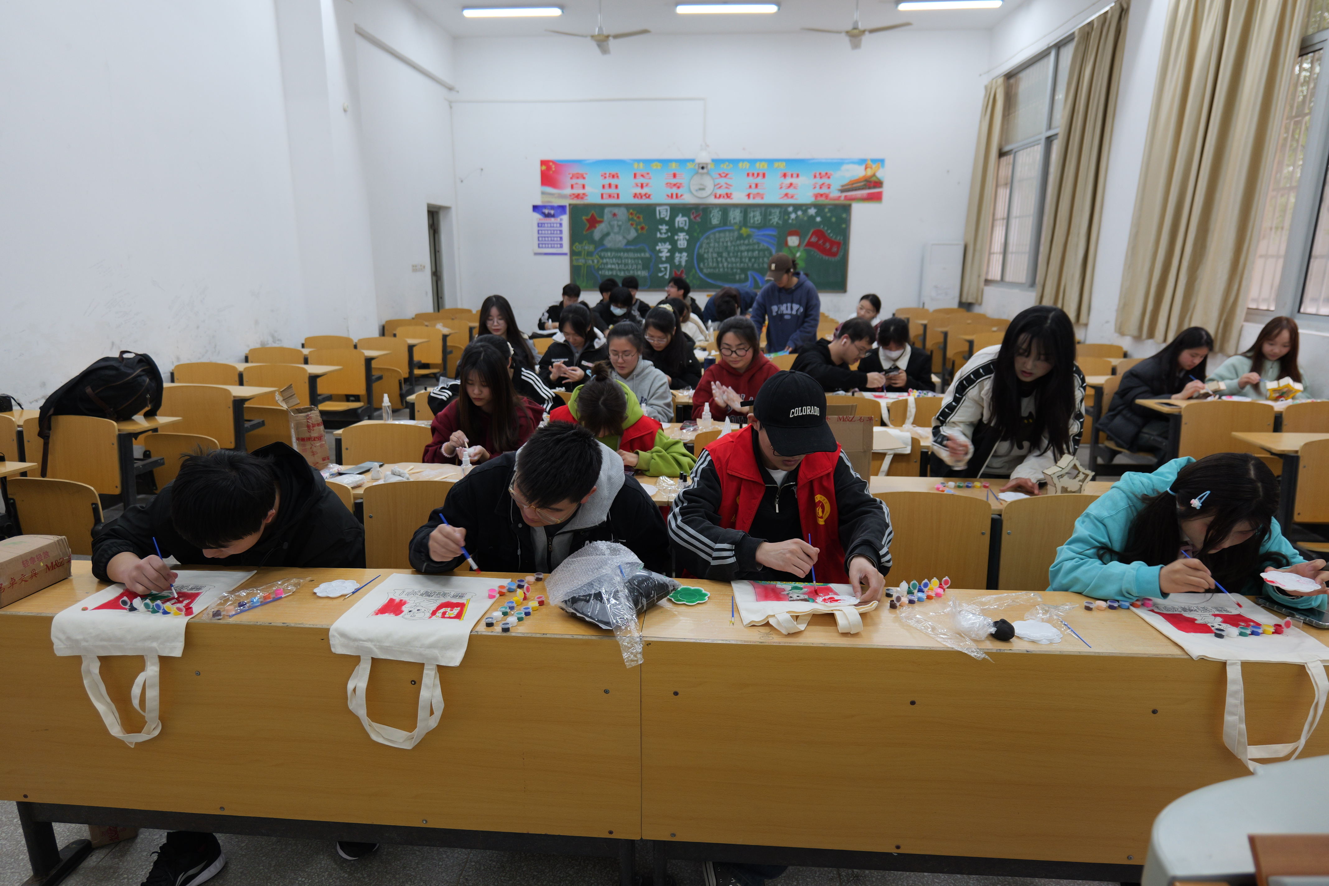 舒窃职业礼仪社、指尖艺术社和追梦文艺社联合开展“小手创雷锋,欢乐齐行动”主题活动,让同学们在手工制作活动中,感受雷锋月的氛围。同学们或在空白帆布包上,画上雷锋人物形象;或用折纸折出小小的雷锋帽。手工创作的过程精细繁琐,同学们静心创作,在这样的过程中升华了心中对雷锋同志的敬意。