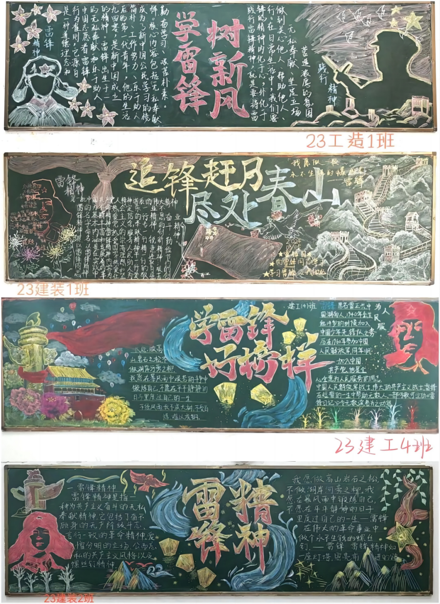 “学习雷锋精神”主题板报绘制活动。为学习和弘扬雷锋精神,该院开展以“学习雷锋精神”为主题的黑板报评比活动。通过这次主题板报绘制活动,同学们不仅学习了雷锋同志的先进事迹和崇高精神,而且更深刻地认识了雷锋精神的时代价值。让我们携手共进,将雷锋精神传承下去,为构建和谐社会贡献自己的智慧和力量吧!