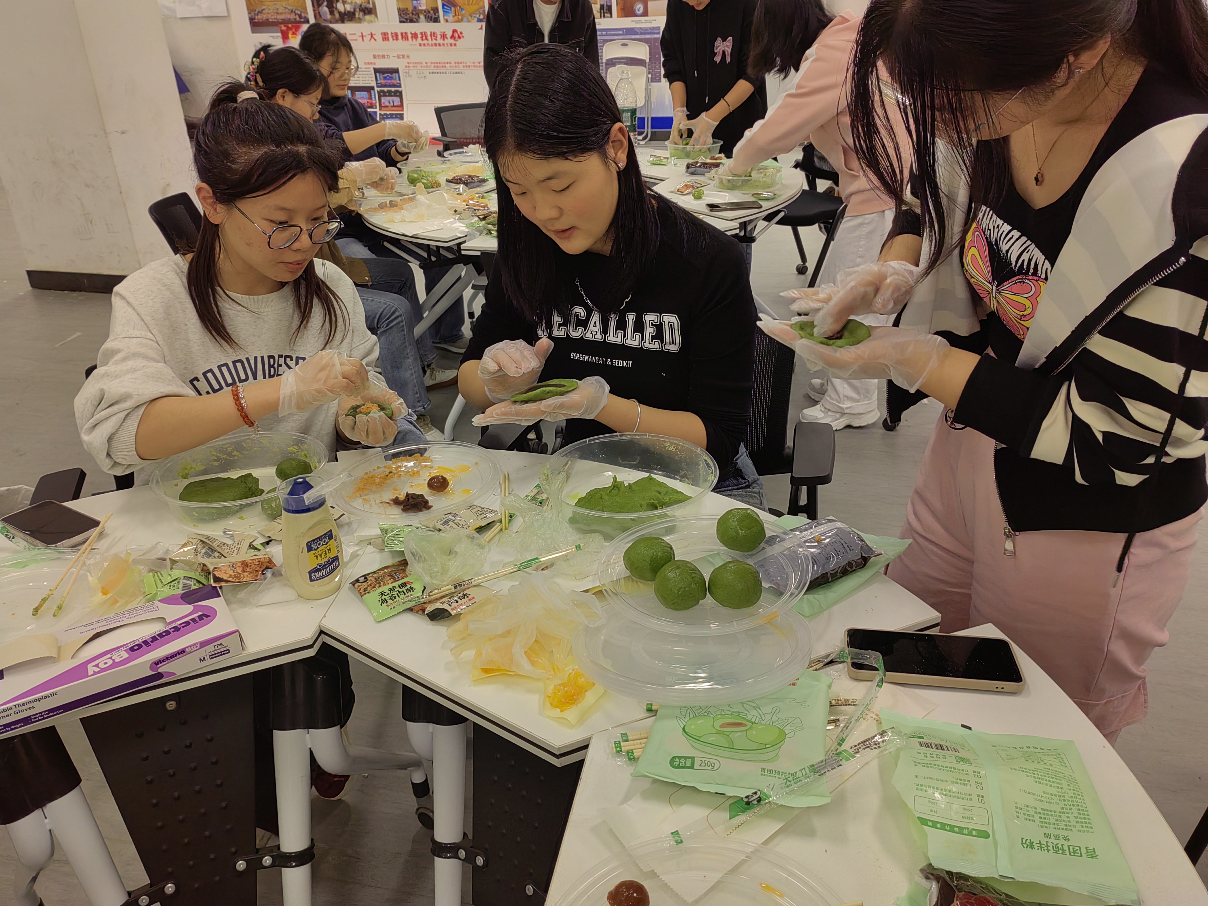 活动一:手工制作青团,传承民俗美食。4月2日中午,社团联合会约40名同学在大学生活动中心开展了手工制作青团活动。活动中,首先播放了制作青团的视频教程,看完了详细的过程,同学们纷纷跃跃欲试,经过揉、捏、拍、压等制作,一个个颜色翠绿、圆润饱满的青团就做好了。同学们拿起自己亲手包的青团咬下一口,豆沙的甜蜜伴着艾草的清香交织在唇齿间,吃起来更觉得香甜可口。同学们一边吃着自己包的美味青团,一边交流着清明文化习俗。