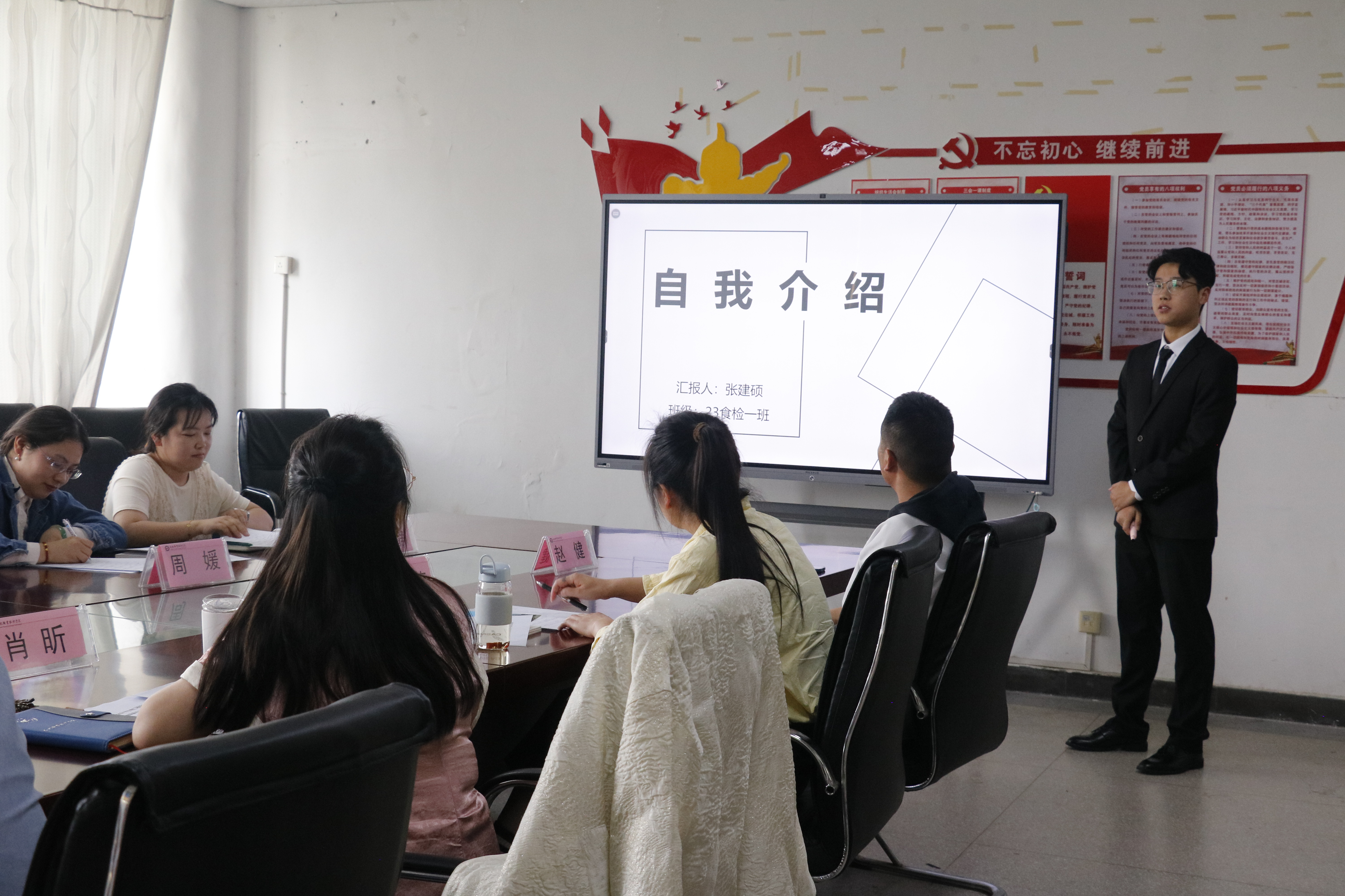 大会开始前,9名竞选人员准时到场,开始抽签。抽签结束,竞选正式开始。9名候选人依次上场,每个人结合PPT从自我介绍、个人经历、自我剖析、未来规划四个方面进行展示,展示时间为5分钟。随后评委老师提问,候选人思考作答1分钟,回答问题2分钟,回答完毕评委打分。9名候选人着装正式,仪态落落大方,沉着冷静,表达流畅,对于评委老师的提问对答如流,展现了良好的精神面貌和心理素质,赢得评委老师们的阵阵掌声。