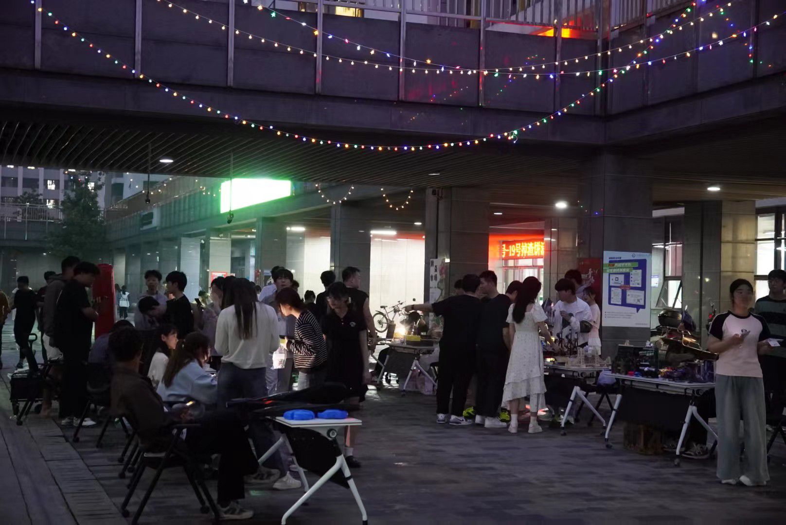 活动现场被彩灯装点的十分温馨,学生街道两旁的摊位上摆满了各式各样的物品,从生活用品和充满创意的手工艺品,再到趣味十足的游玩项目,琳琅满目,应有尽有。现场的热闹氛围如同一幅生动的画卷,充满了喧嚣与活力。摊位间人流如织,熙熙攘攘,同学们的交谈声、欢笑声和讨价还价声交织在一起,形成了一首欢快的交响曲。空气中弥漫着属于校园的青春活力,令人沉醉其中。