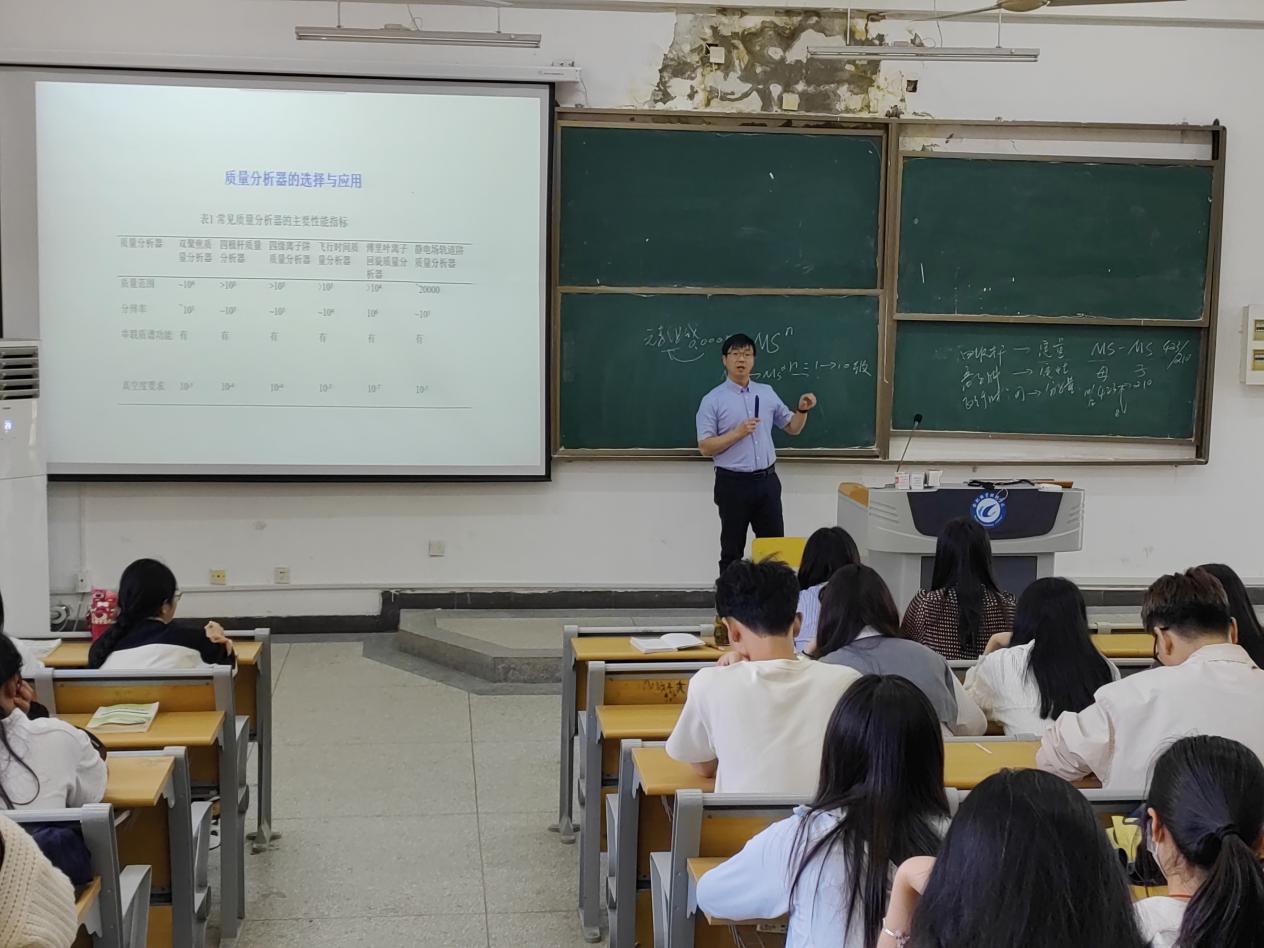 首先汪电雷教授从质谱结构引入,重点讲解质谱技术在分析多领域的应用及发展。在生活中应用以合肥市生活污水中违禁药物的监测为切入点,通过质谱四极杆的联合应用,降低监测噪音,提高分析的灵敏度,使超低浓度物质检测成为可能。以自身课题研究内容为例,聚焦质谱技术在中药研究的应用。提示质谱分析技术不仅应用于科学实验室,还可以生活中应用,为国家在违禁药物监测方面提供科学手段,从而激发了学生对分析技术前沿知识兴趣和热爱。