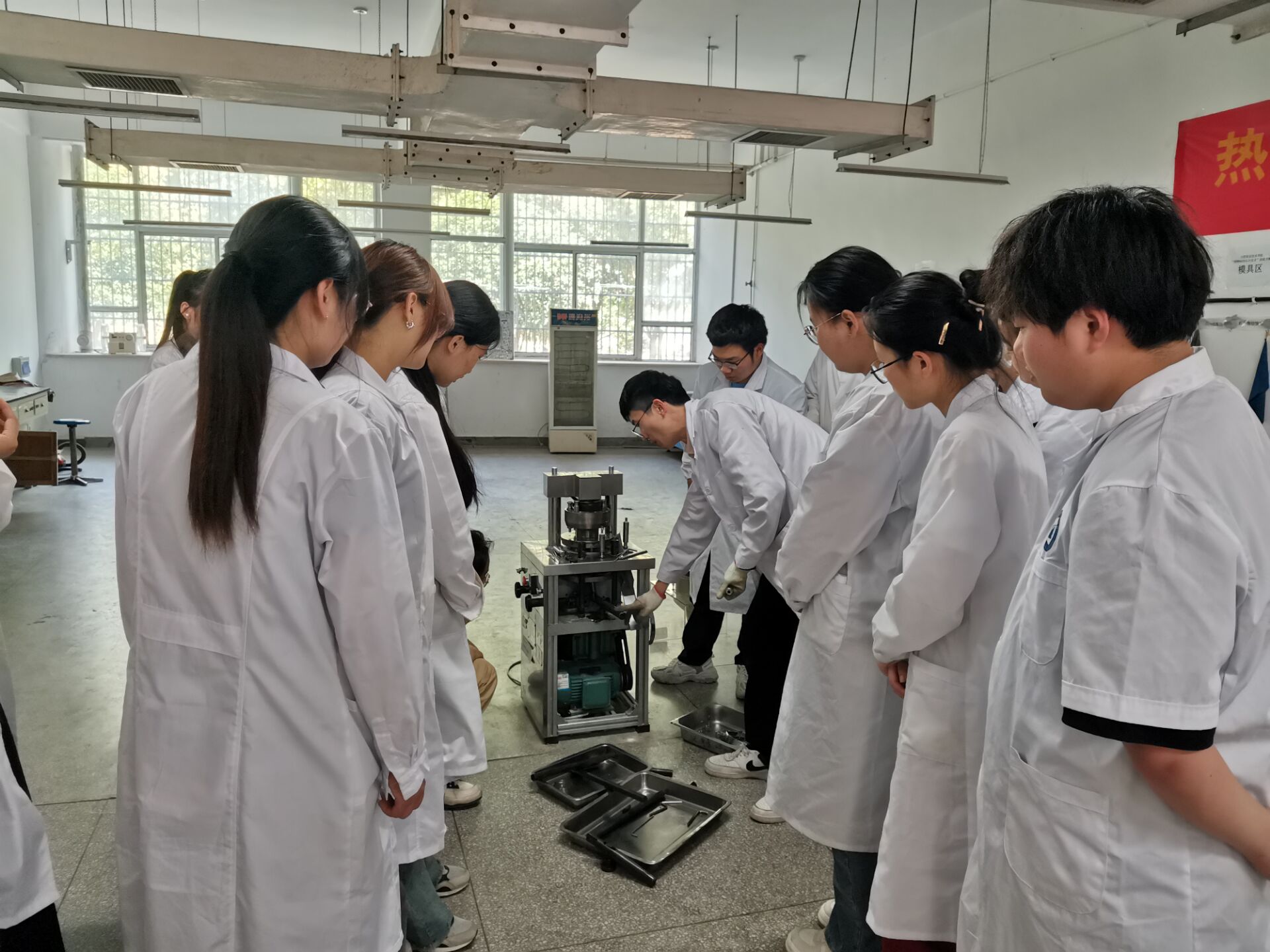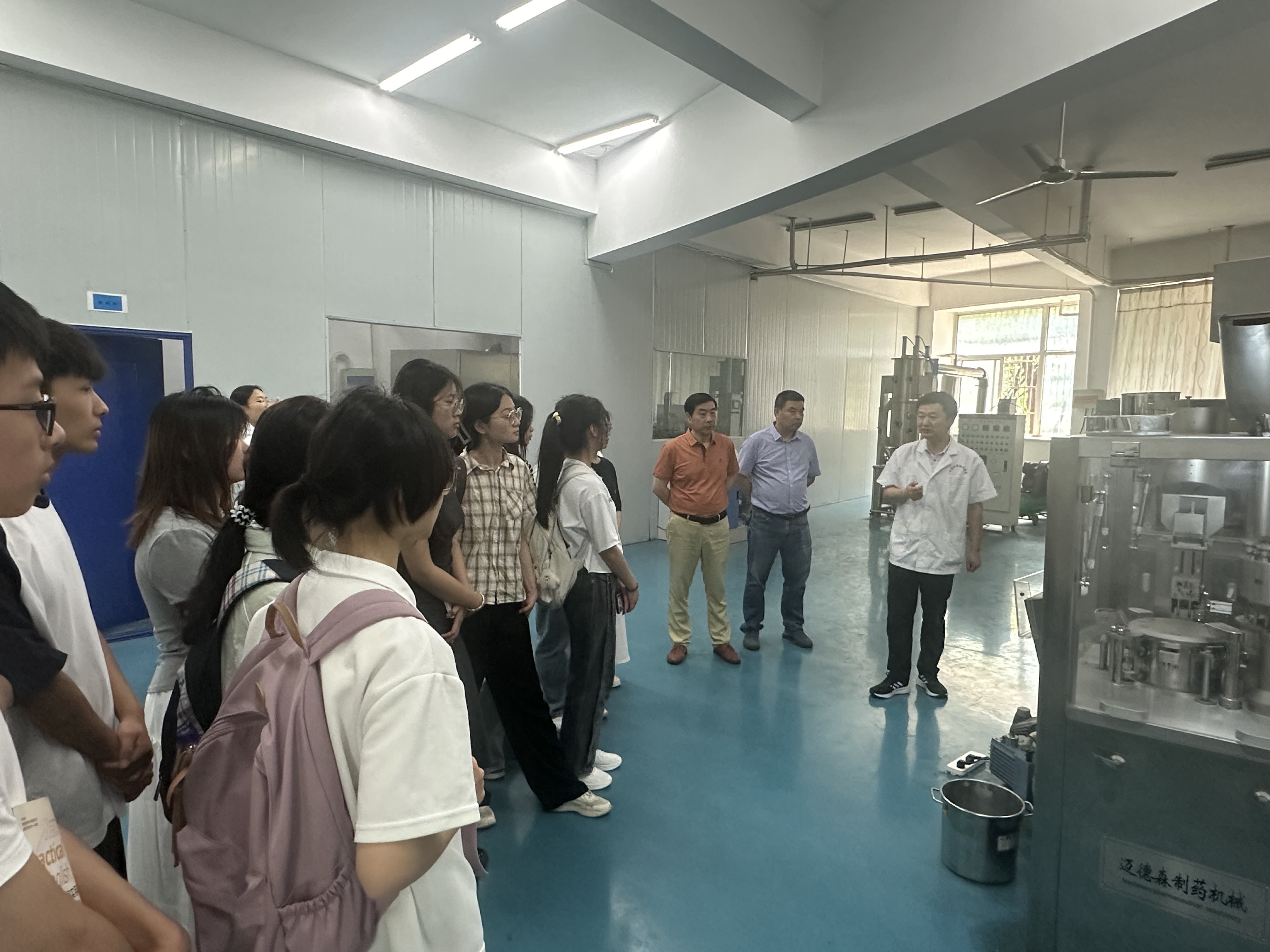 首先,范高福老师引入现代制药企业发展趋势及企业文化进行宣讲,强调制药岗位洁净度要求、规范性生产及质控重要性。现场对全自动37冲旋转压片机、全自动单轨胶囊填充机及智能包衣机的工作原理、结构组成、注意事项进行详细讲解,并示范演示操作,展示了生产型制药设备操控要点。