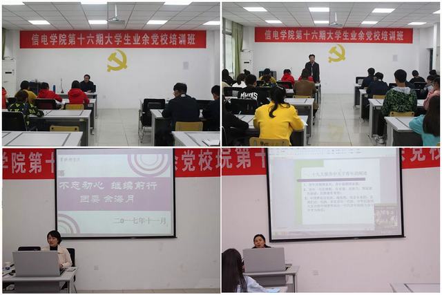 本期业余党校培训班结合新时代大学生特点,开展了丰富多样的培训学习活动。党校学习历时两周,共分为五次专题讲座三次活动一次考试,讲座分别由校党委委员、纪委书记金辉,校宣传部长魏华,校团委书记佘海月、信电学院院长章炳林,信电学院党总支副书记余洋老师主讲。还开展了小组学习讨论、红色电影展播、志愿服务活动和结业考试。