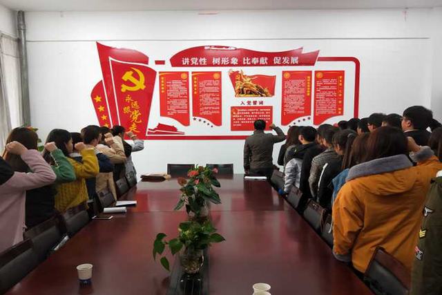 大会在全体党员和发展对象学习《中国共产党章程》中拉开了序幕。根据大会议程,会议首先由胡佩佩等35名同志向大会宣读《入党志愿书》,并陈述个人学习、生活、实习工作、思想的发展情况;随后由入党介绍人分别对35名发展对象在考察期内的培养及考察情况向大会作了相关介绍;接着,支部组织委员刘泽发同志向大会介绍了35位发展对象的综合政审情况;之后,全体与会党员表达了对该35名发展对象的想法和建议;后经支部党员广泛讨论,有表决权的正式党员投票表决,胡佩佩等35名位同志得到了全体与会党员的一致认可,获得了全票通过,党支部也正式通过了接收该35名同志为中共预备党员,并在组织委员刘泽发同志领誓下面对党旗庄严宣誓。
