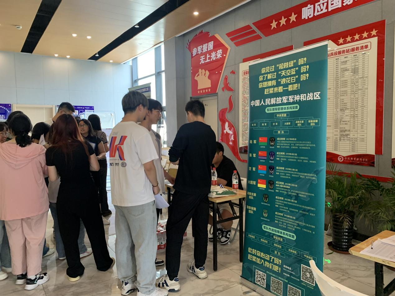 5月22日下午,在学院毕业实习双选会现场,学院设征兵政策宣传台,向全院学生介绍入伍条件、入伍流程、入伍优待政策等。现场摸排意向入伍大学生人数近40名。