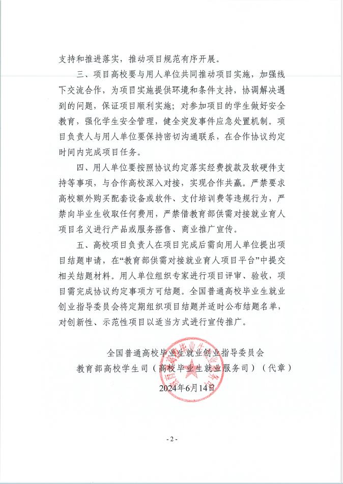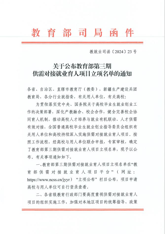 供需对接就业育人项目是教育部贯彻落实党中央、国务院“稳就业”决策部署,持续推进深化高等教育改革、完善市场化社会化就业促进机制的重要举措之一,旨在汇聚更多社会力量共同做好高校毕业生就业工作。供需对接就业育人项目分为定向人才培养培训、就业实践实习基地建设、人力资源提升、重点领域校企合作、重点群体就业帮扶五类。就业实践实习基地建设项目由高校与用人单位共建就业实践实习基地,为高校毕业生提供实习岗位,帮助毕业生通过实习实现就业。