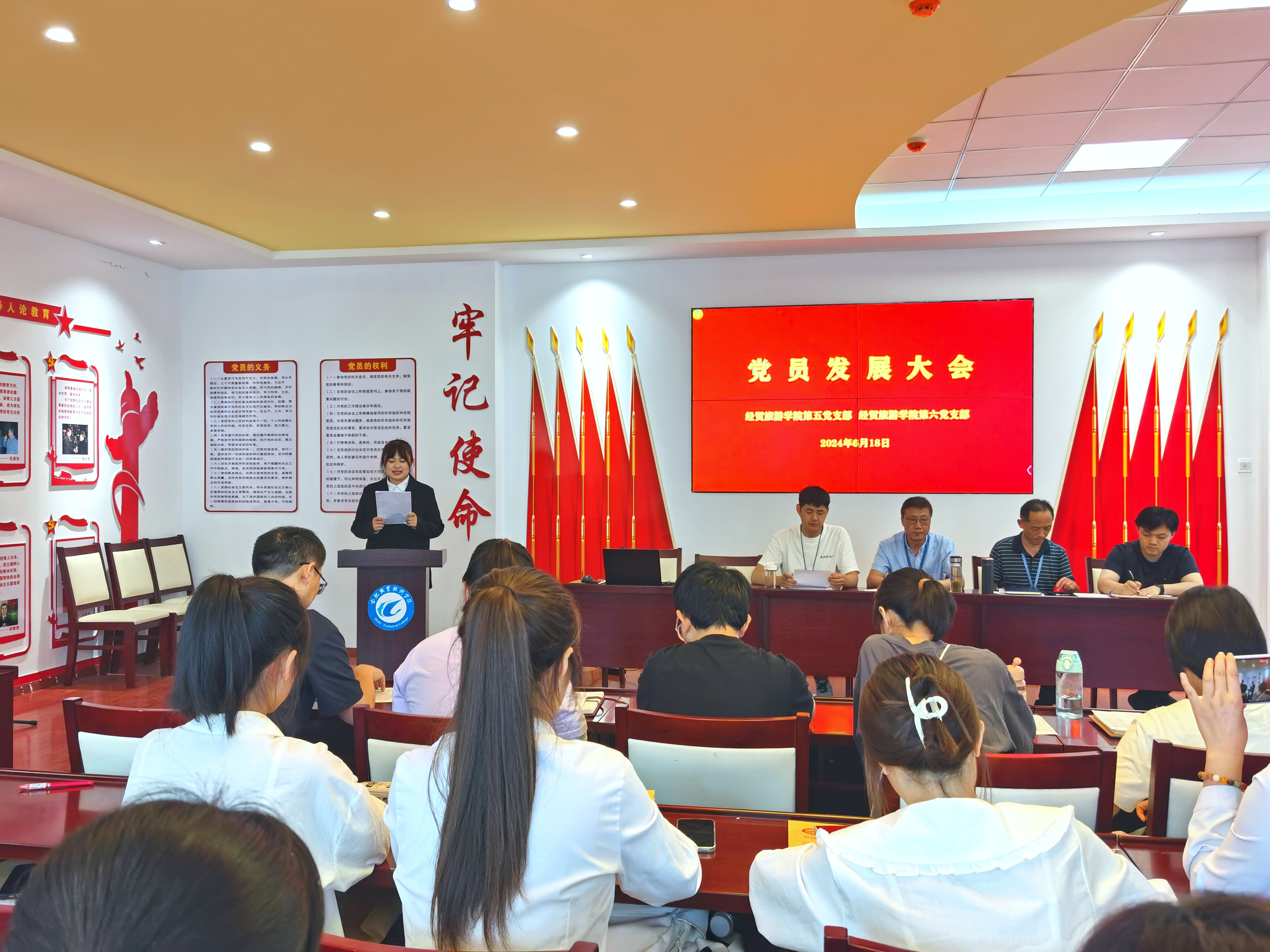 6月18日下午,经贸旅游学院第五党支部、第六党支部在经贸楼三楼党性体验馆召开党员大会,讨论接收闫雨牧等23名同志为中国共产党预备党员。会议由第五党支部书记王明明主持,两个支部的全体党员参加了会议。