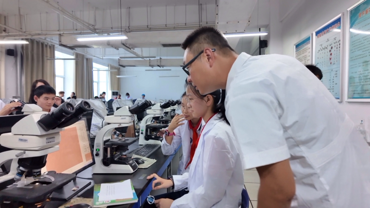 显微镜观察洋葱表皮细胞实验、制作红细胞悬液,显微镜高倍镜下观察红细胞形态。高级实验师于治国担任队员们的实验教师,于治国老师课前询问队员们刚从哪里来,引导队员们从肉眼可见的人体标本到细胞微观世界的实验课堂。