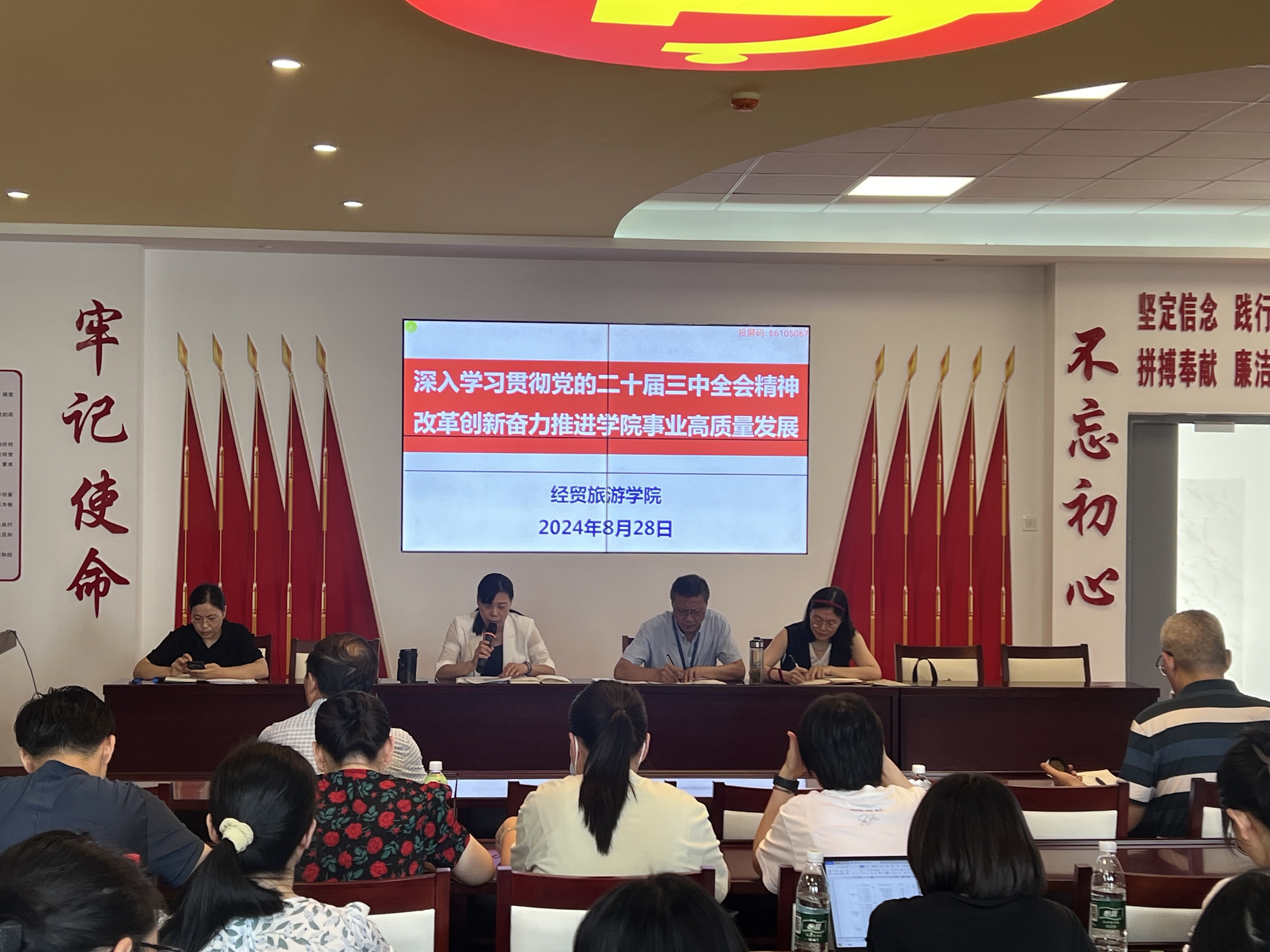 为不断提升教职工政治素养,统一思想认识、凝聚奋进力量,明确新学期工作任务,8月28日下午,经贸旅游学院在党性体验馆召开政治理论学习会暨2024-2025学年第一学期开学第一次教职工大会。学院党政和全体教职工参加会议,会议由院长赵红主持。
