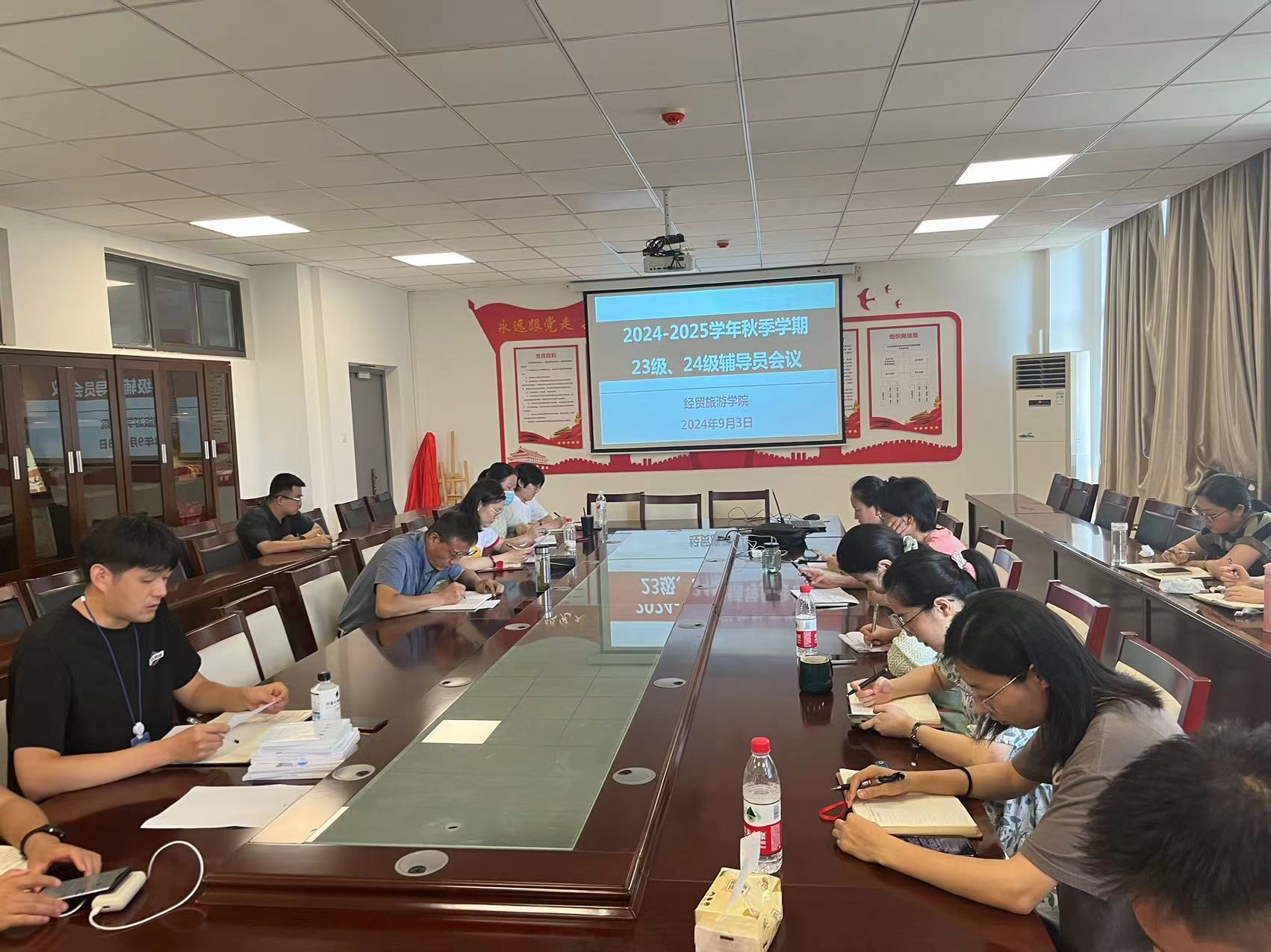 为做好新学年秋季学期工作,9月3号下午,经贸旅游学院在经贸楼3楼会议室召开2023级、2024级班级辅导员会议。会议由学院学管办主任王明明主持,学院党总支书记梅亚松、副书记赵倩倩、学管办全体专职辅导员、全体2023级、2024级班级辅导员,2024级新生班级学生助理参加了此次会议。