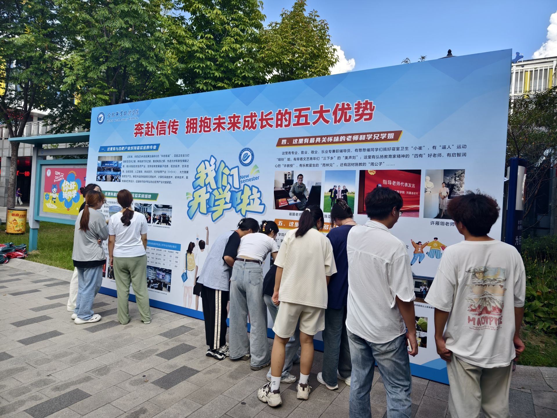 迎新宣传语,凸显优势展“诚心”。从学院正门上方电子屏的“弘扬工匠精神,励志技能报国 ”,到学院门厅的一块块专业介绍展板上的“五金”建设展示,再到迎新喷绘墙上的五大优势介绍(专业与产业对接度、实验实训场地科技感、就业前景广阔、老师和学长关怀、课外生活丰富),学院从多个维度、多个方面展现特色,“诚心”十足地帮助新生认识学院,关注自身未来发展。