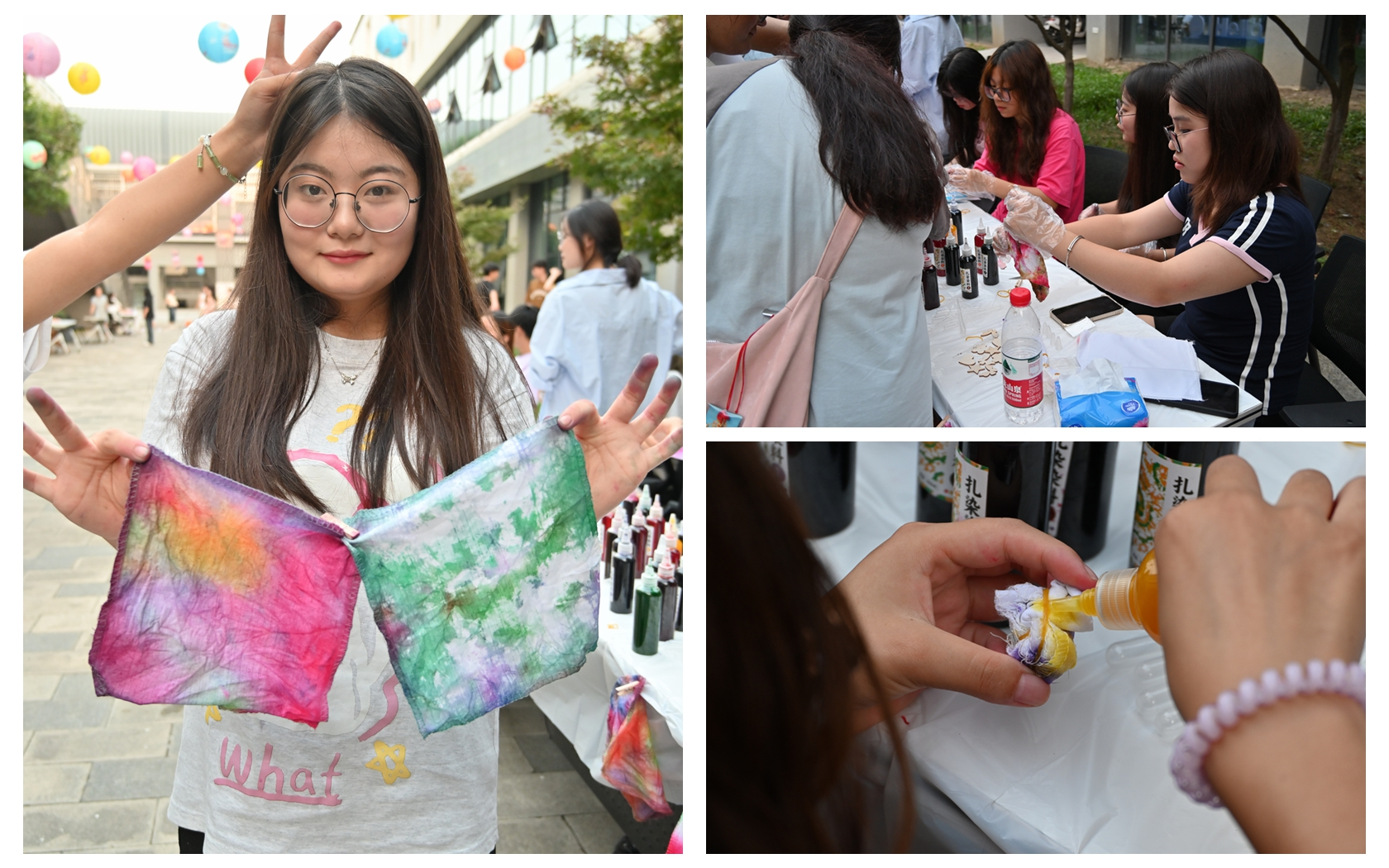 “青取之于蓝,而青于蓝。”散落在诗词里的自然“蓝”,落在布料上变成了颜色“蓝”,也就诞生了中华独特的染色工艺——扎染。在这一活动环节中,在老师和青年志愿者的指导下,大家充分发挥想象力,将布料进行缠绕、蜷曲、折叠、固定,小心翼翼地将扎好的布料放入染料中,等待着神奇的变化。布料展开的那一刻,大家都被眼前绚丽多彩、意想不到的精美图案所惊倒。
