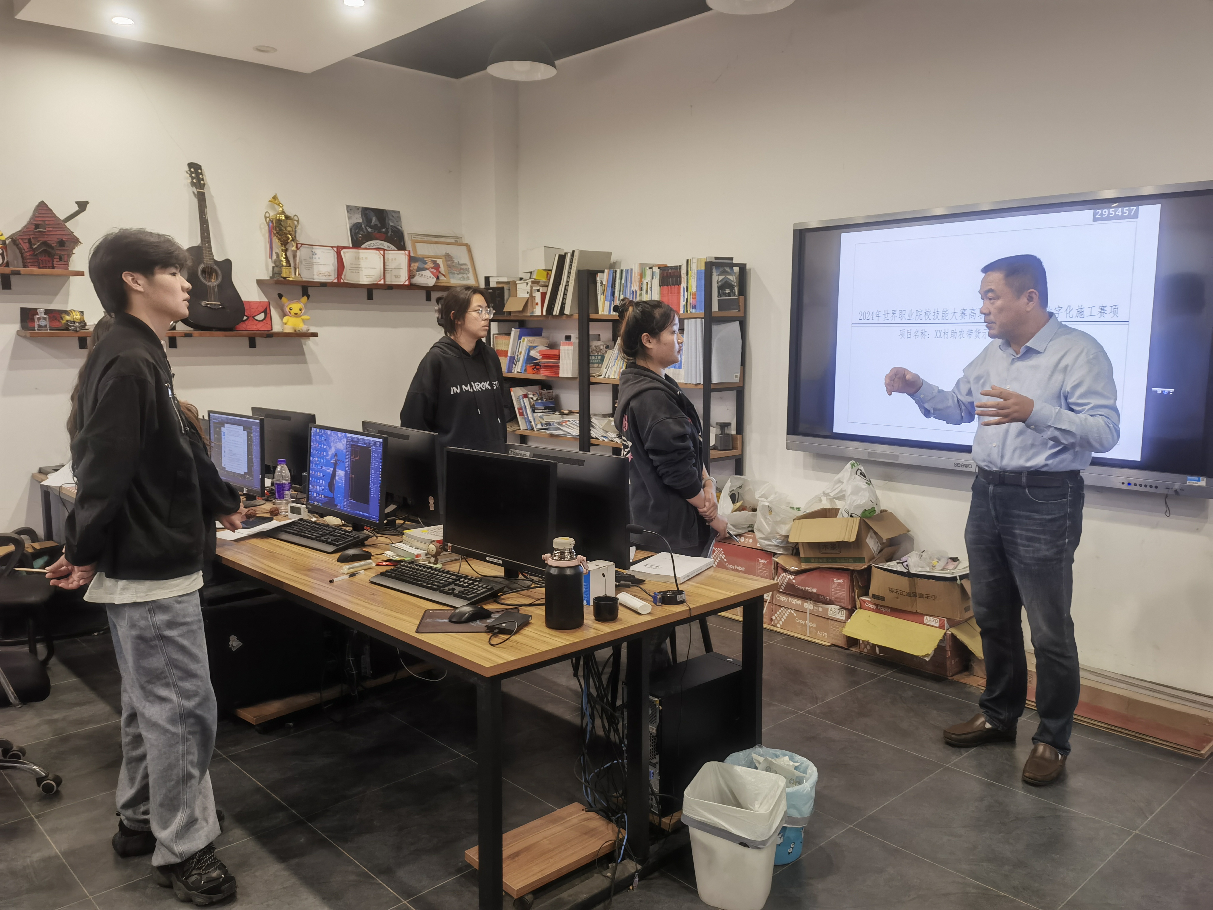 为做好2024年世界职业院校技能大赛备赛工作,进一步提升学生技能水平,10月15日下午,“范家茂技术技能型大师工作室”在建筑装饰工程设计工作室组织召开了建筑装饰数字化施工赛项备赛研讨会。校党委委员、副校长、工作室负责人范家茂出席会议,建筑工程学院党总支副书记(主持工作)丁怡琴、副书记施芳芳、专业教师沈子高、指导教师杨健及参赛学生参加会议。会议由该院副院长邓勋主持。