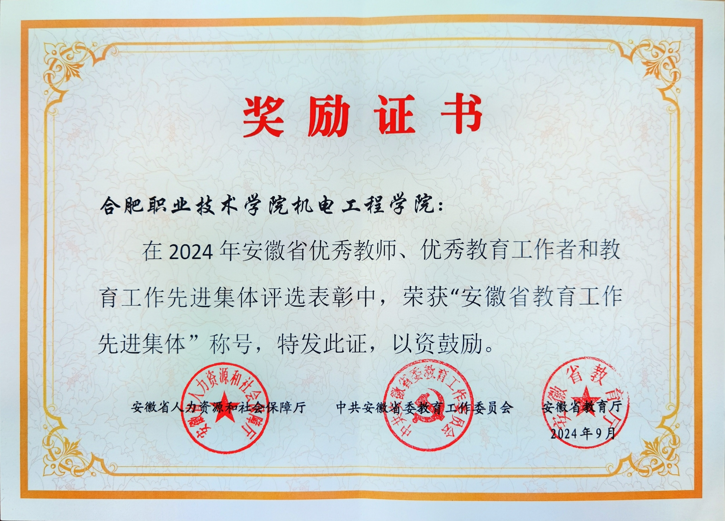 近日,安徽省人力资源和社会保障厅、中共安徽省委教育工委、安徽省教育厅发布了《关于表彰2024年安徽省优秀教师、优秀教育工作者和教育工作先进集体的决定》。机电工程学院凭借其在教育教学、产教融合及人才培养等多个领域取得的成就,荣获了2024年“安徽省教育工作先进集体”荣誉称号。