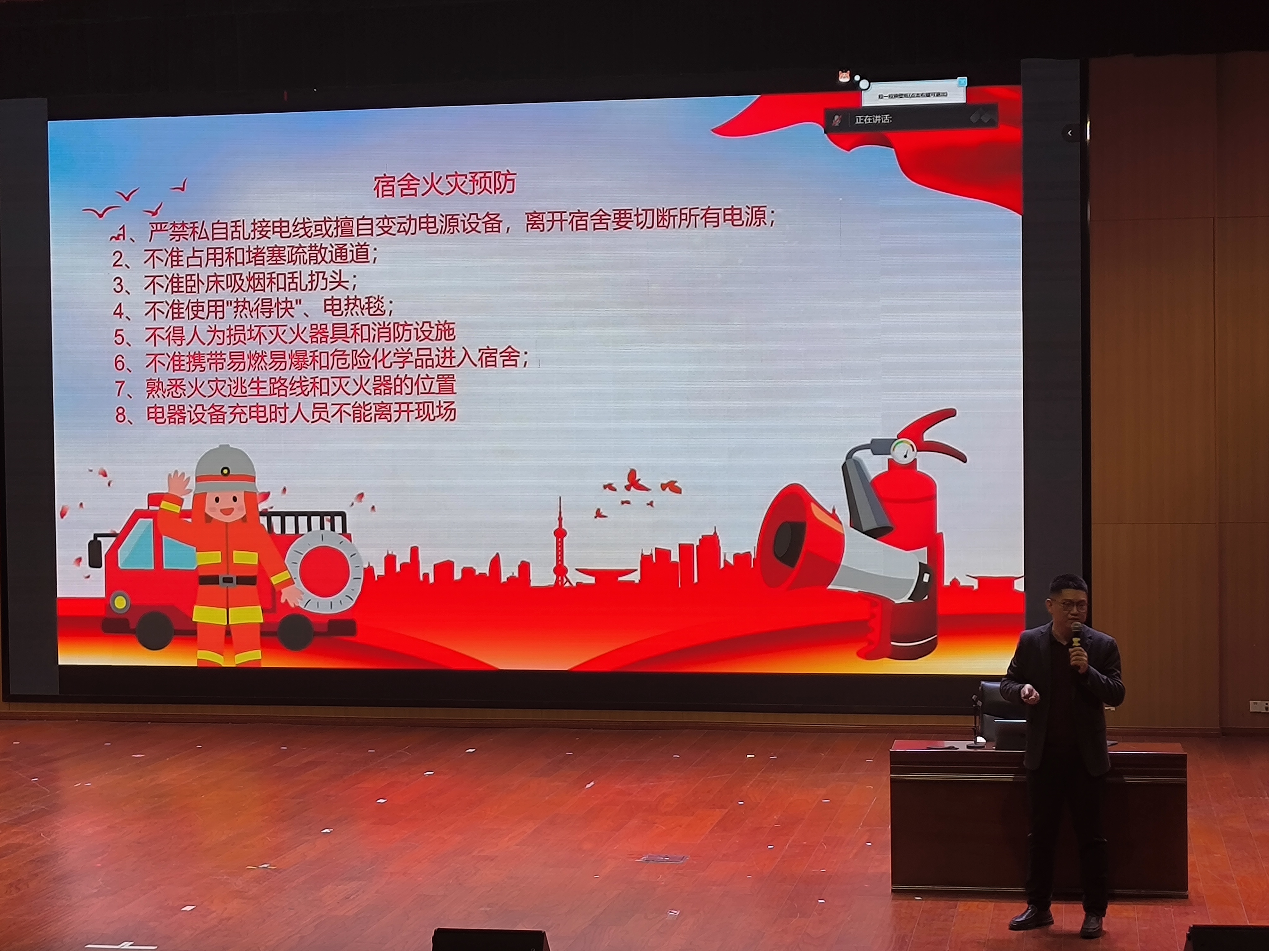 本次宣讲分两个阶段进行,第一阶段唐晨龙工程师结合近年来发生在高校和社会单位的火灾惨案为切入点,通过播放触目惊心的新闻视频,生动地揭示了火灾带来的严重后果,并希望广大师生可以严格遵守各种消防规定,将火灾隐患扼杀在摇篮之中。