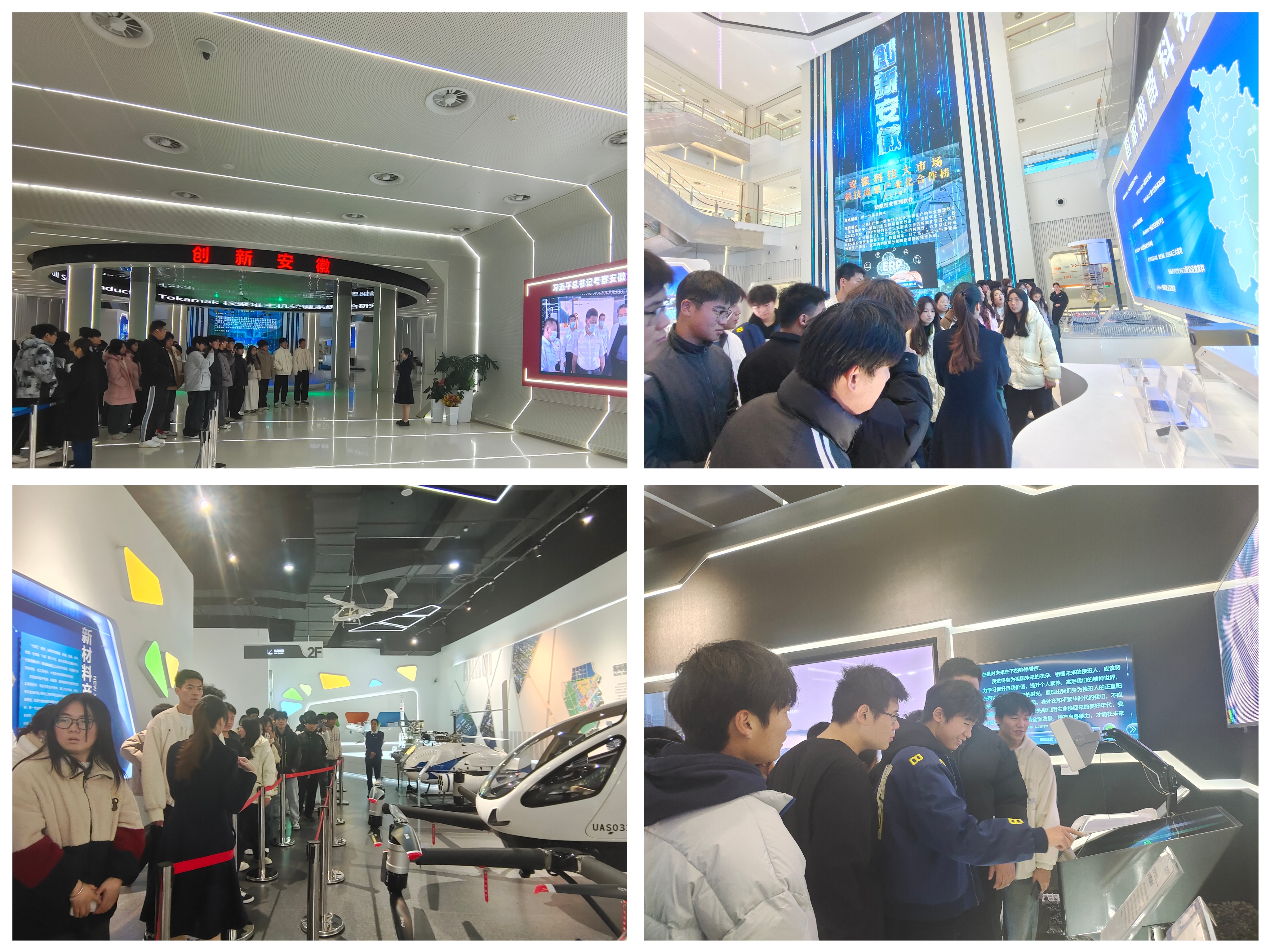 参观前,吴老师带领同学们深入学习了习近平总书记10月17、18日考察安徽的重要讲话精神。在安徽创新馆,琳琅满目的科技成果、激荡江淮的创新力量吸引参观者驻足观看。同学们沉浸式感受安徽科技创新工作的新进展、新突破,深刻认识到科技创新对推进中国式现代化的重大意义。入口设置大科学装置展示台,将合肥综合性国家科学中心的大科学装置沙盘与安徽版图相呼应。漫步神秘幽深的“量子隧道”,感受时空穿越;在“创新时光沙漏”里,“墨子号”卫星、“悟空号”暗物质探测卫星、平流层飞艇等浮空装置被串起,彰显着安徽的创新活力。