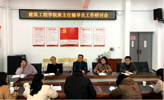 2018年3月9号下午3:40,建筑工程学院在会议室208召开学院班主任、辅导员工作研讨会,参加会议的有学院党政负责人、在校2016、2017级班主任和辅导员,会议由党总支副书记王文俊同志主持。