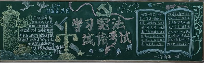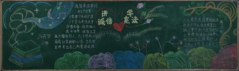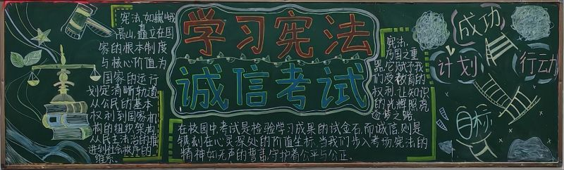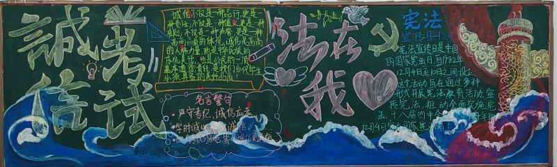 他们以宪法为启蒙之光,点亮智慧明灯,引领同学们在宪法知识的海洋中遨游,不断汲取法治精神的养分。同时,他们通过生动的漫画形象以及创意标语等形式,将诚信考试的内容巧妙融入其中,使黑板报既具有教育意义,又富有吸引力,激发了同学们学习宪法的热情与诚信考试的自觉。