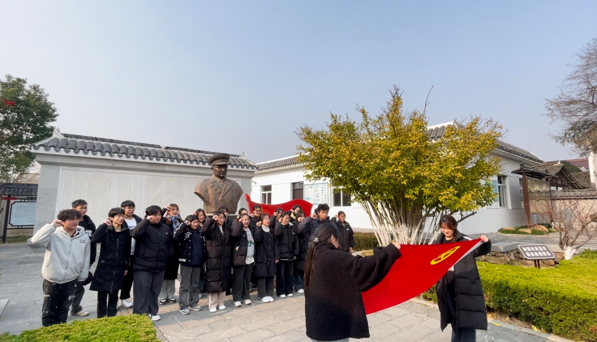 在李克农故居,师生们在讲解员带领下瞻仰了李克农雕像,有序参观了李克农故居及生平事迹展馆,通过现场观看一帧帧画面、一件件物品,深入学习李克农将军深入龙潭虎穴、保卫国家安全的故事,被其奋勇无畏的革命精神和赤胆忠心的爱国主义精神所深深感染。随后,在集中入团仪式上,优秀团员代表柏和袁同学带领21名新发展团员面向鲜红的团旗,右手握拳,进行了庄严的入团宣誓。