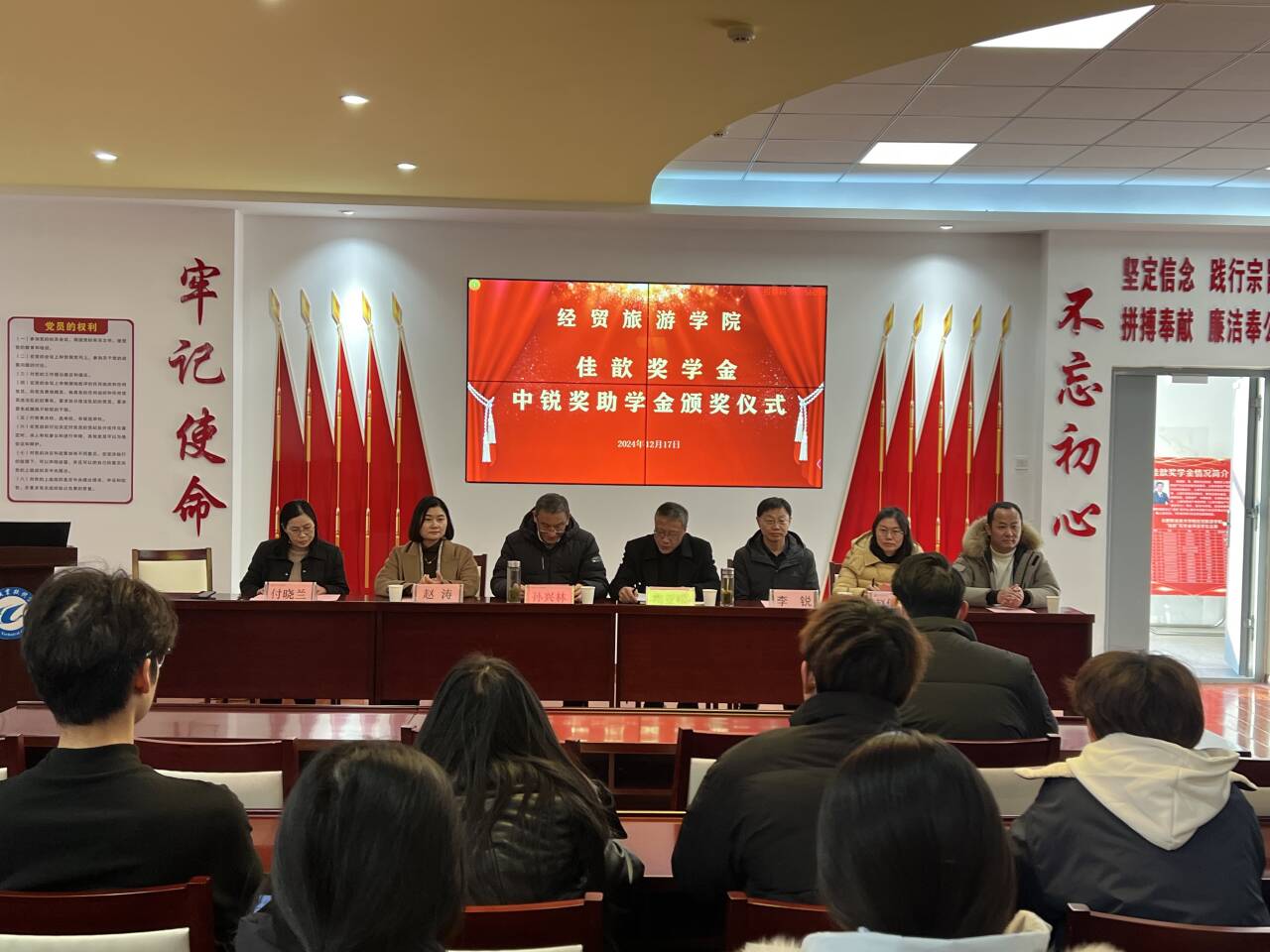 12月17日下午,经贸旅游学院在党性体验馆举行2024年佳歆奖学金、中锐奖助学金颁奖仪式。校关工委副主任孙兴林、安徽中锐税务师事务所有限责任公司董事长李锐、上海佳歆房地产投资顾问有限公司总经理赵涛、该院党政领导班子、学院学管办全体辅导员、全体获奖学生和部分学生代表参加了此次颁奖仪式。颁奖仪式由该院党总支书记梅亚松主持。