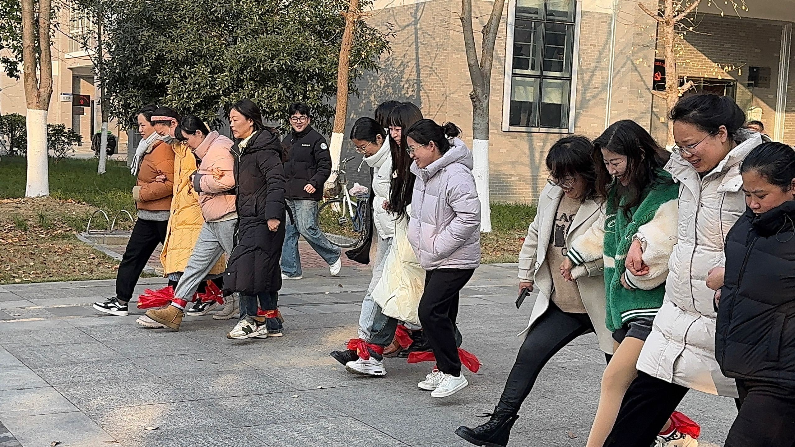 四人五足游戏中,教职工们四人为一组,将彼此的左右脚绑在一起。随着一声令下,步伐协调一致地向终点迈进。有的组合步伐轻盈,速度飞快,宛如一人在奔跑;而有的组合则略显蹒跚,但他们相互扶持,始终坚持,脸上洋溢着灿烂的笑容。赛场上不时传来因步伐错乱而引发的欢笑声,加油声、喝彩声交织在一起,为比赛增添了许多欢乐的色彩。