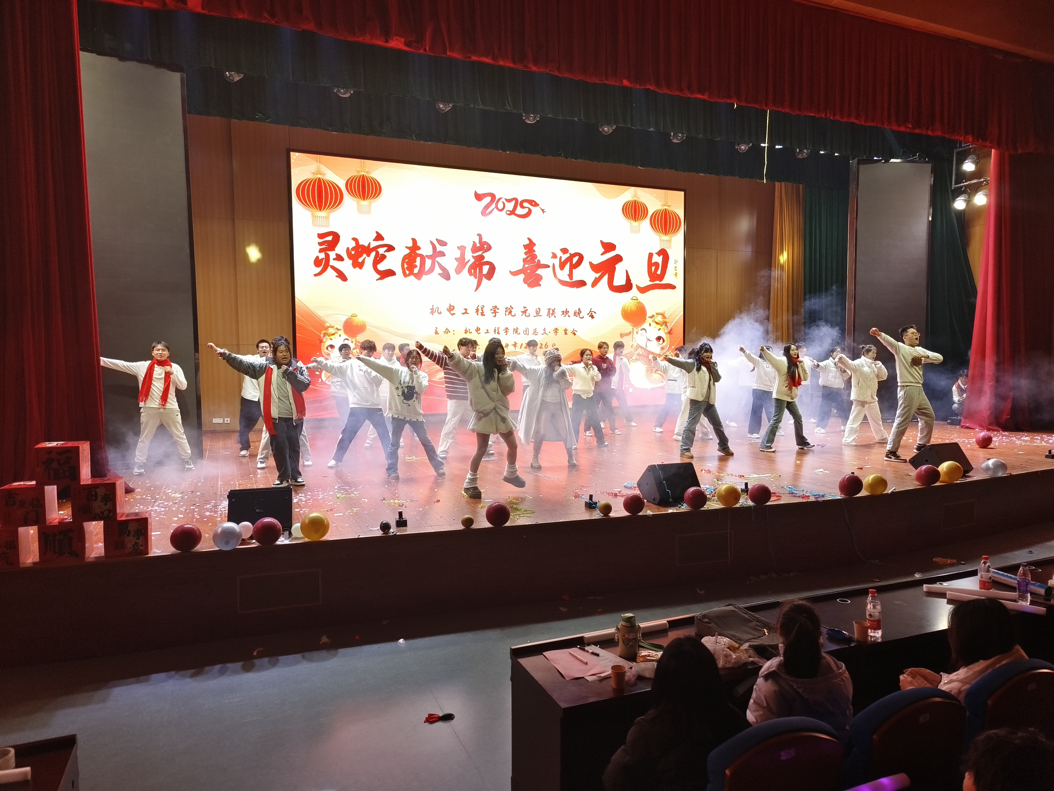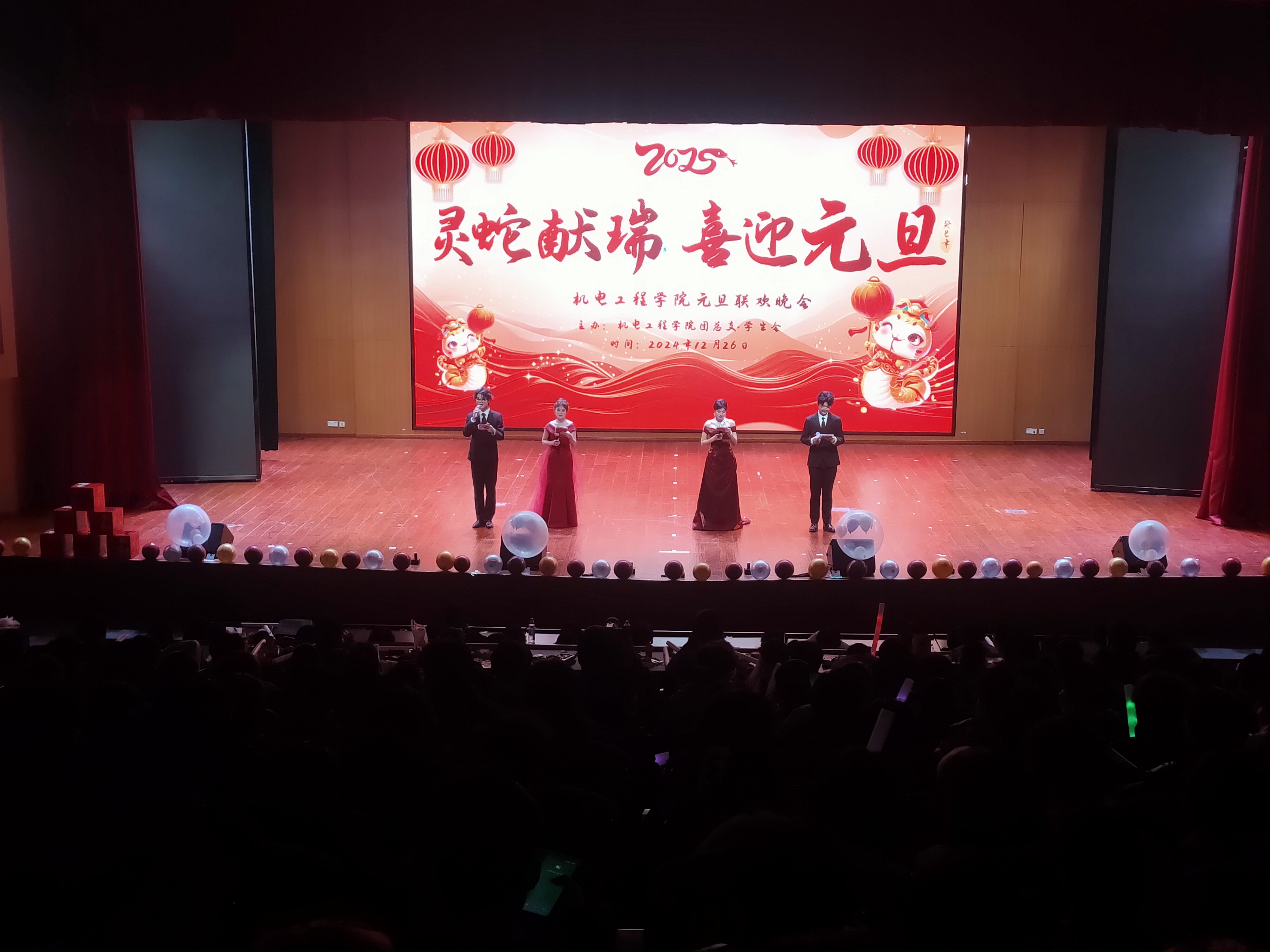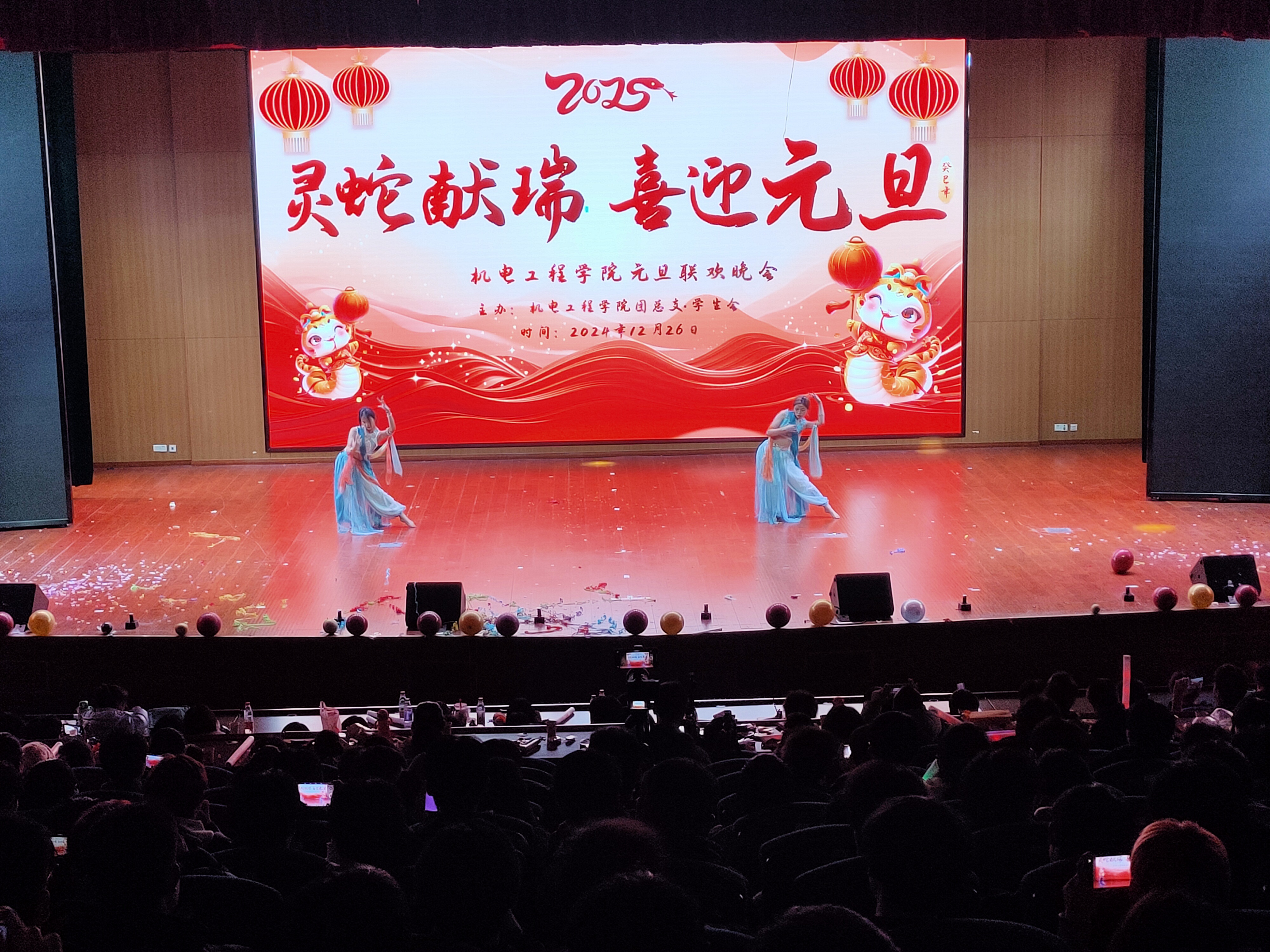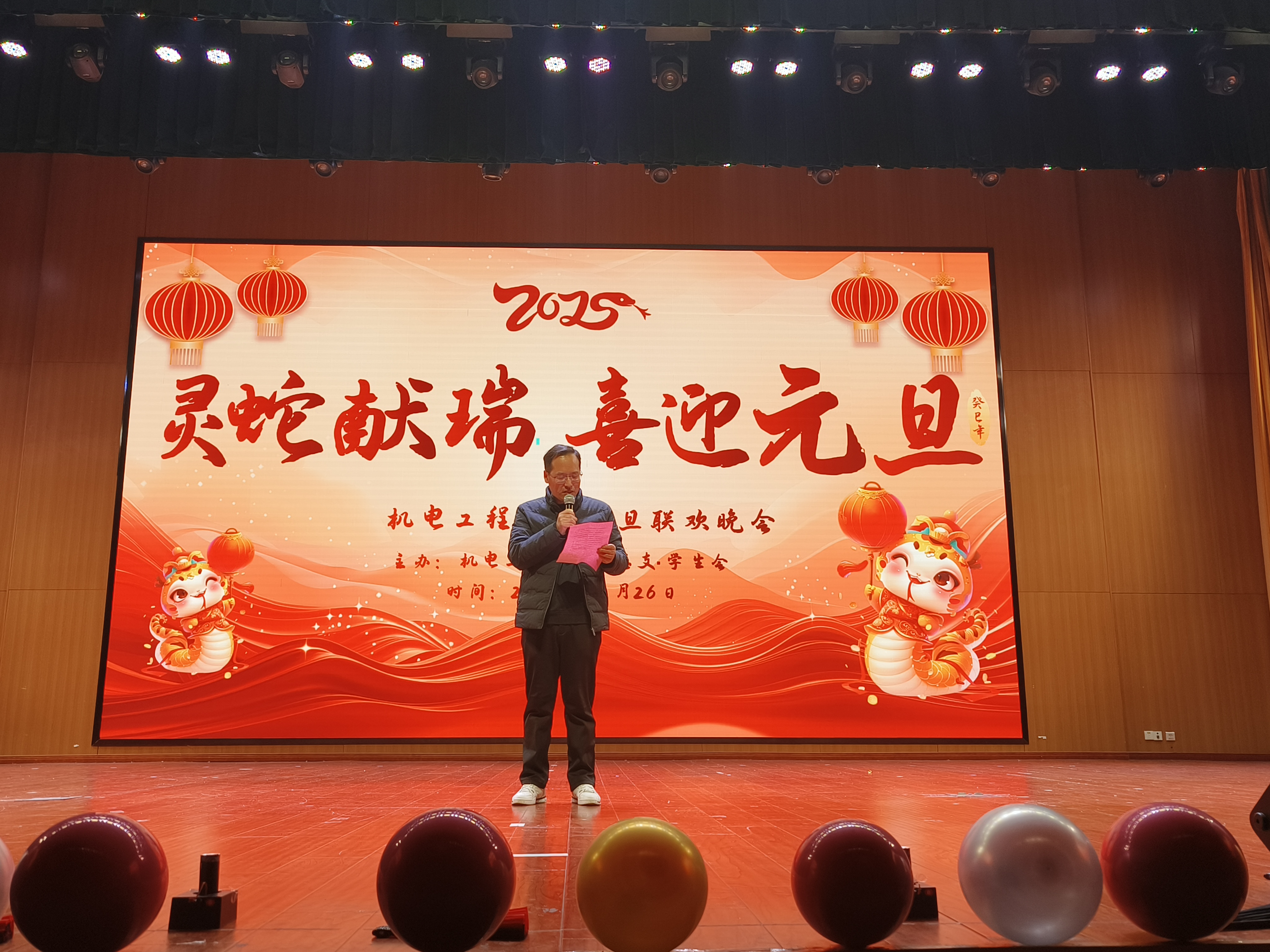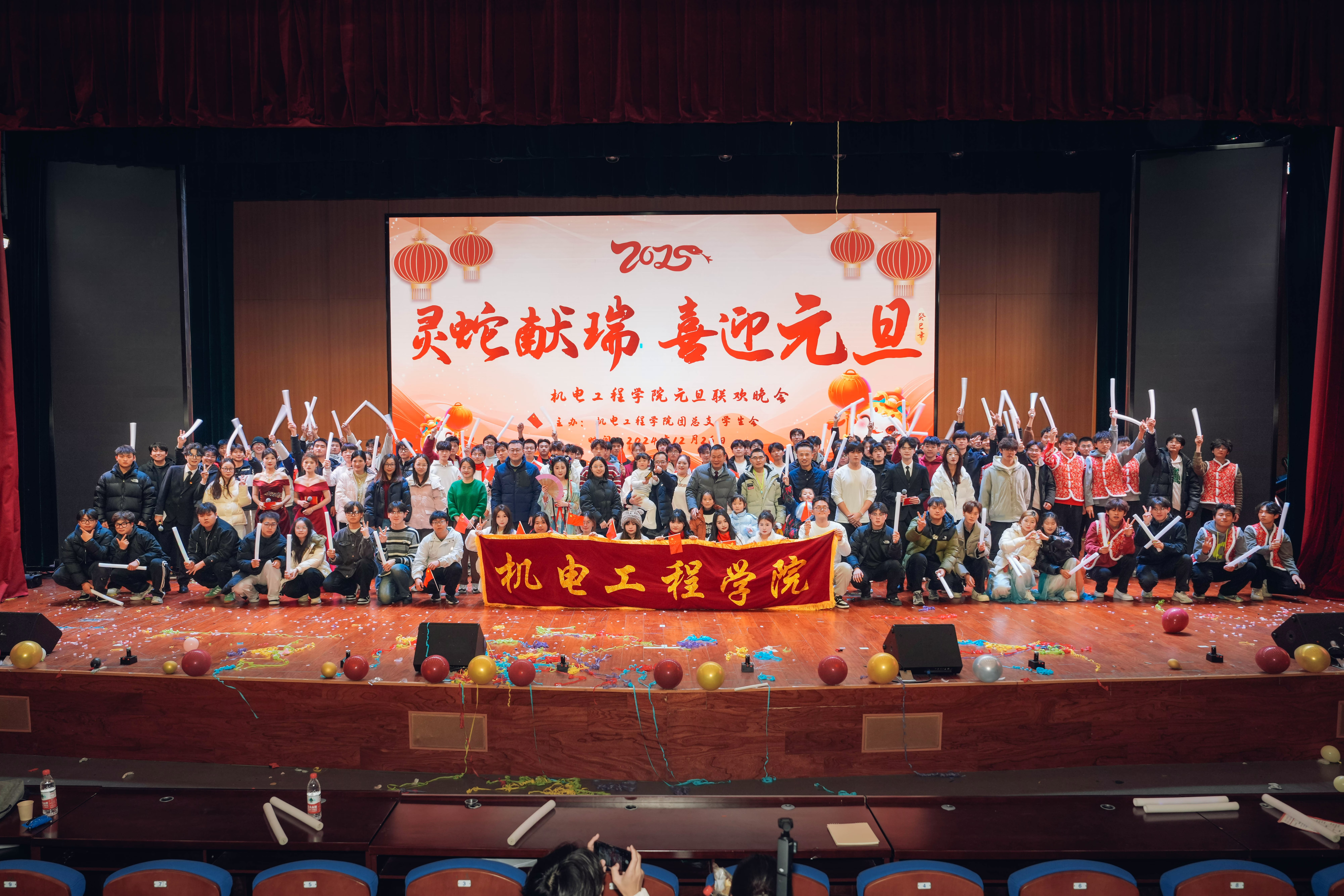 一元复始、万象更新。为弘扬中华优秀传统文化,营造文明和谐、喜庆祥和的新年气氛,充分展现青年学子风采,12月26日晚,机电工程学院在汇心湖校区大学生活动中心二楼报告厅举办“祥蛇献瑞 喜迎元旦”2025年元旦迎新晚会,师生们欢聚一堂,共同迎接新一年的到来。学院党政领导班子、全体专兼职辅导员、教师代表、学校和其他二级学院学生会代表以及400余名新生共同观看演出。