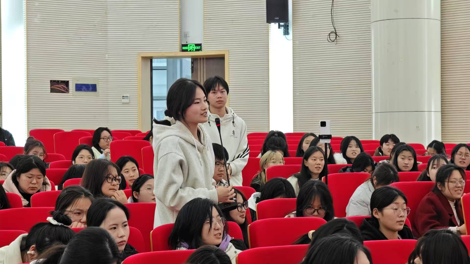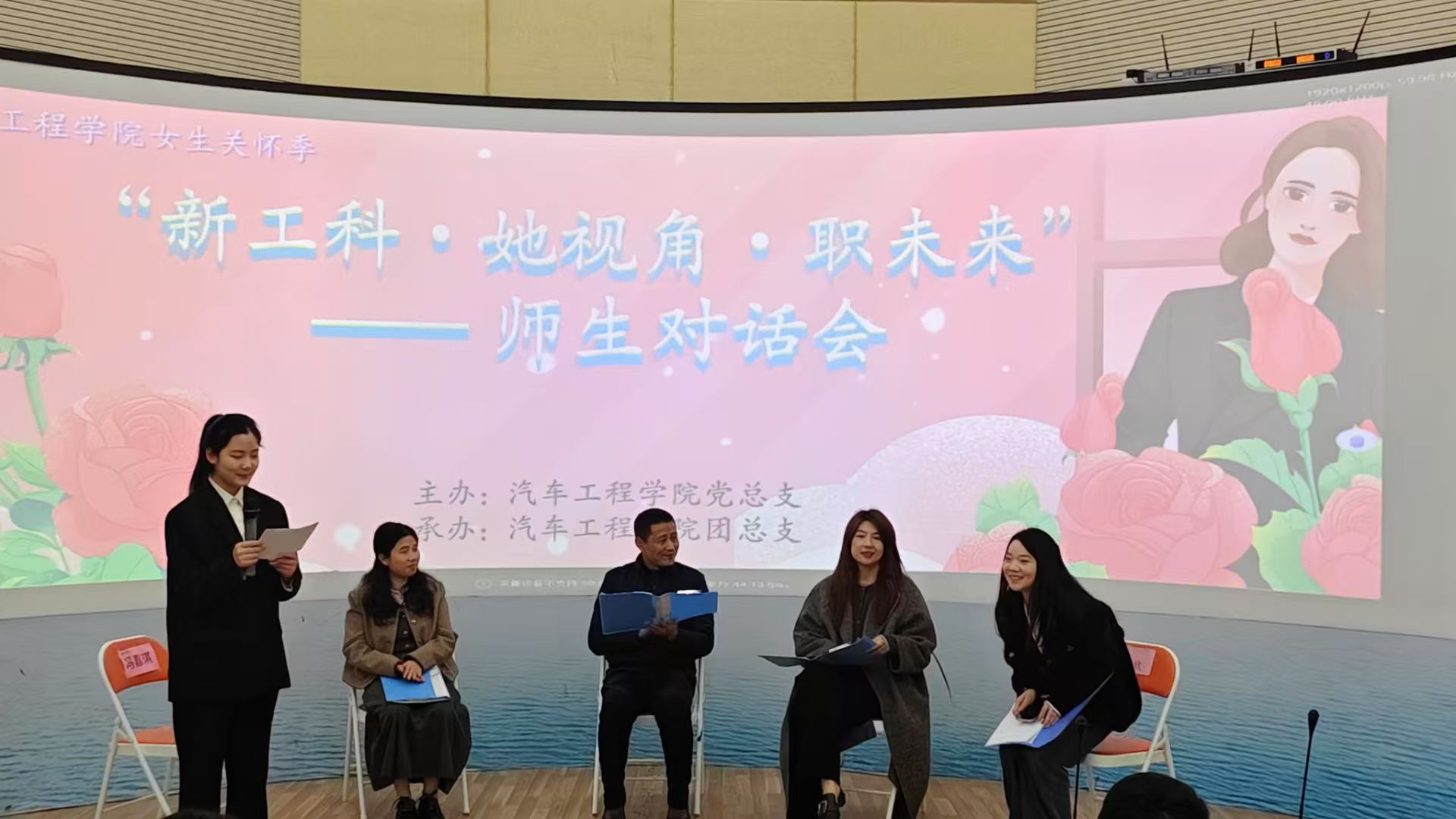 启动仪式结束后,“新工科・她视角・职未来” 师生对话会正式开场。本次对话会由 23 汽营一班冯嘉琪主持,通过线下讨论与线上抖音直播的形式,吸引了全院女生及众多线上观众参与。