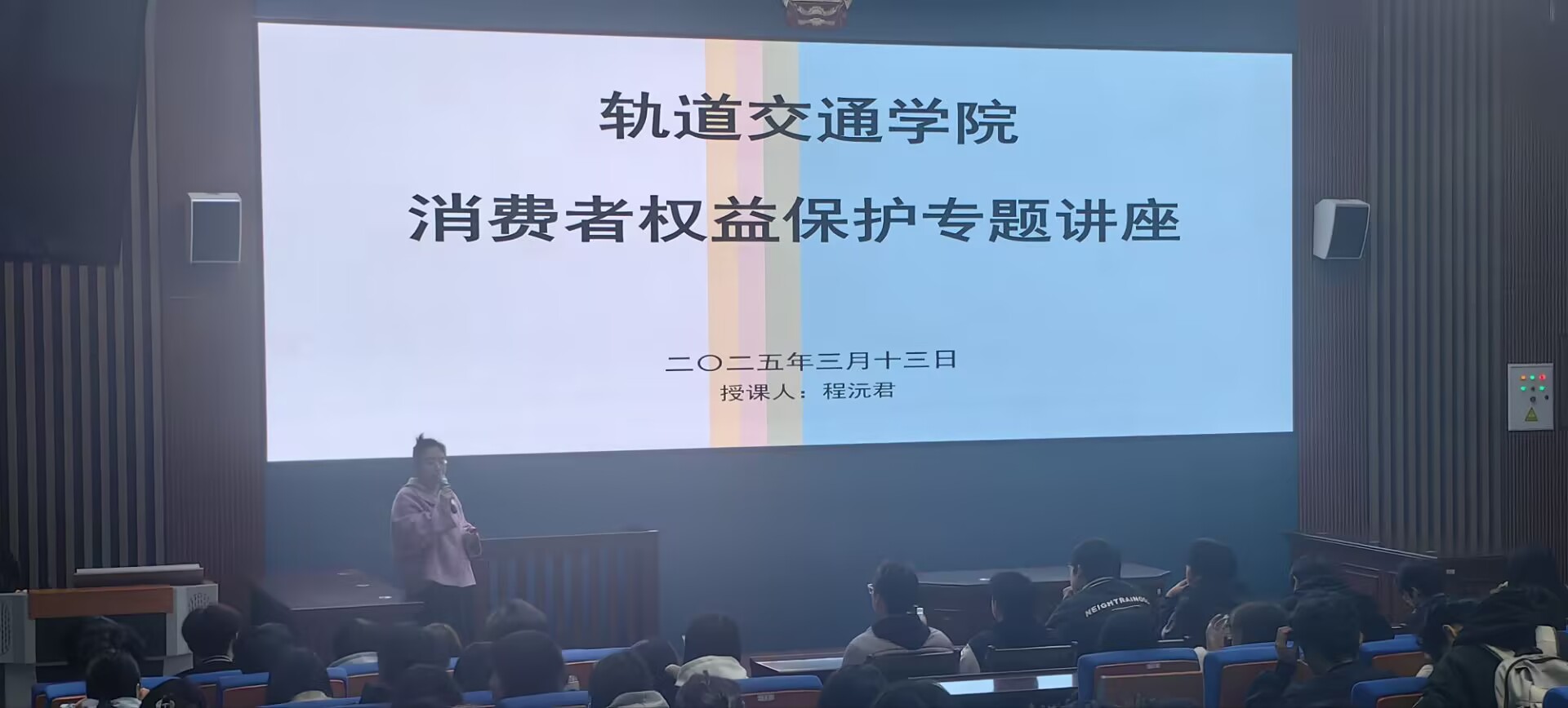 为提高学生法律意识,树立正确的消费观,3月13日,轨道交通学院在教学北楼模拟法庭成功举办了以“校园消费安全与权益保护”为主题的专题讲座。本次讲座由轨道交通学院法律老师程沅君主讲,吸引了众多学生前来聆听,现场座无虚席,气氛热烈。