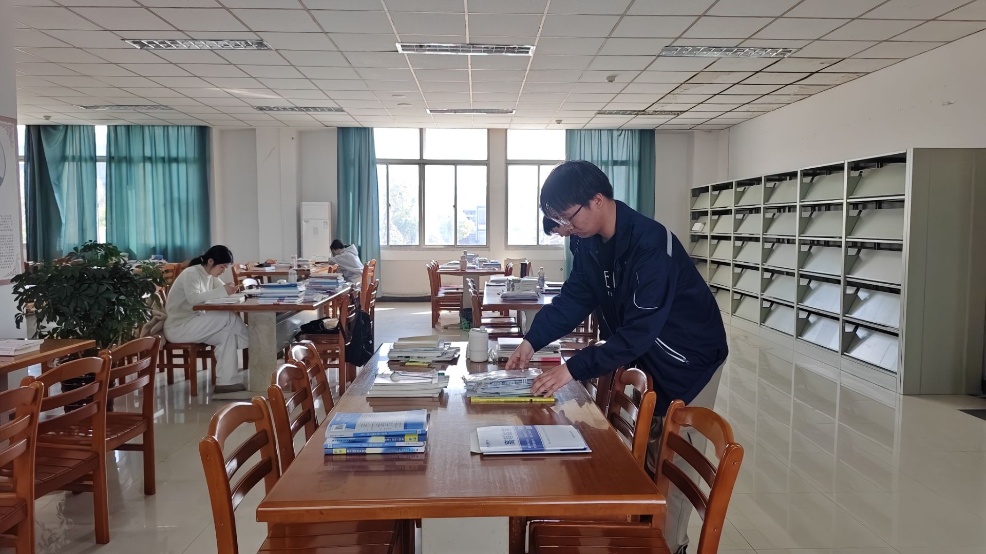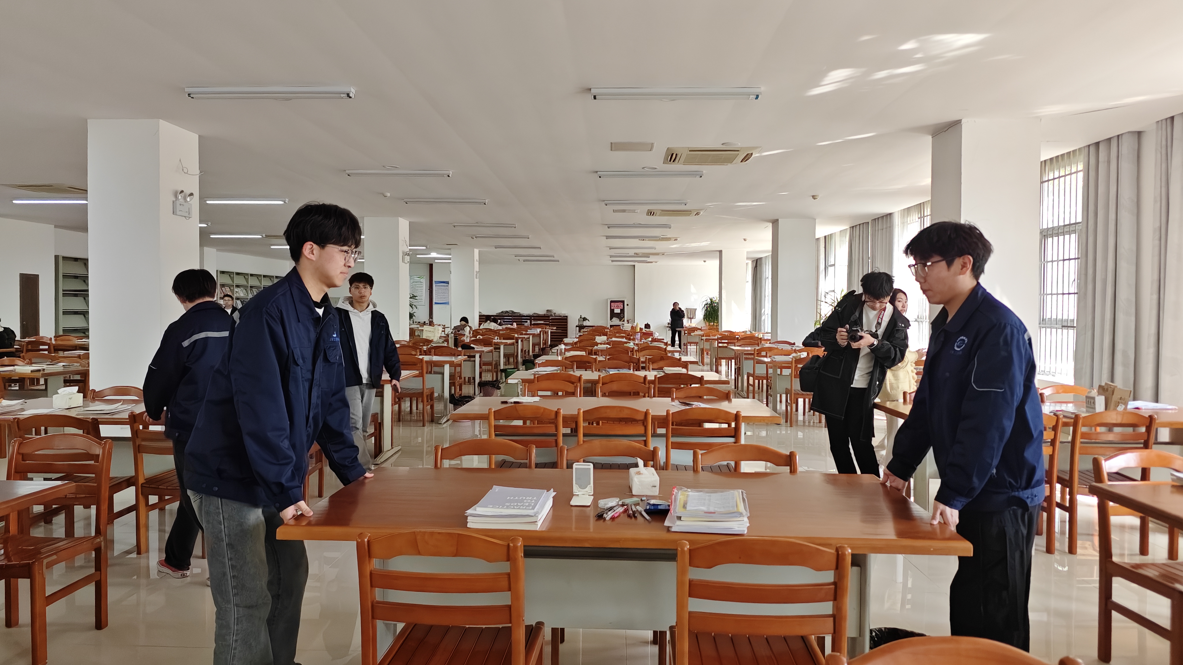 整理图书馆课桌、书本,营造良好学习环境。志愿者们还走进了学院图书馆,对馆内的课桌、书本进行了全面整理。他们擦拭课桌、整理书架,将散落的书本归类放好。在志愿者们的辛勤付出下,学校图书馆的环境焕然一新,为读者营造了一个更加整洁、有序的学习空间。