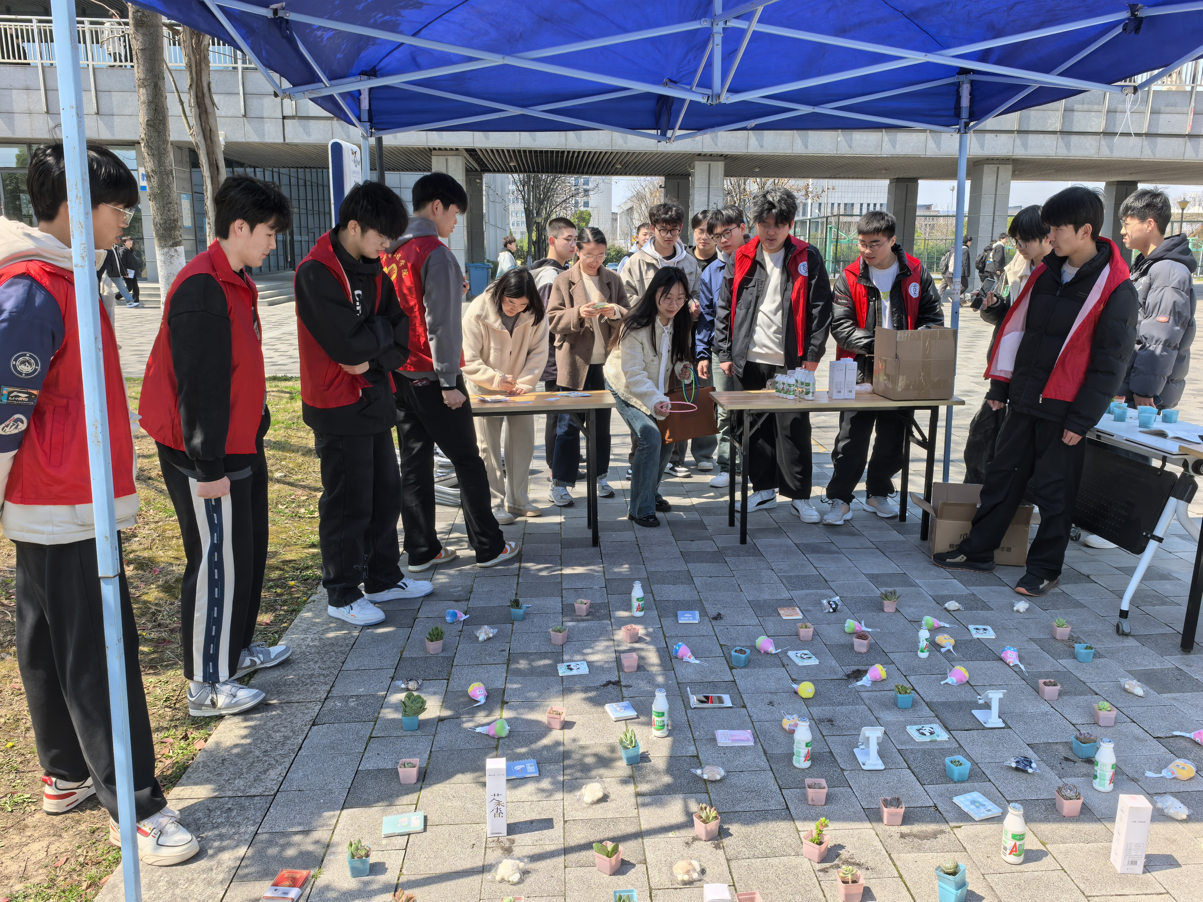 套圈区内,多肉盆栽、文创笔记本、校园主题钥匙扣等礼品琳琅满目,引得同学们跃跃欲试。志愿者们分工明确:有人维持排队秩序,有人整理套圈道具,还有专人协助捡拾套中礼品。活动现场欢呼声此起彼伏——“差一点就套中了!”“看我这个!”参与活动的同学手握套中的盆栽笑道:“没想到节约粮食还能‘解锁’惊喜!”此外,标语墙上逐渐填满的创意手写宣言,也成为校园文明的一道独特风景。
