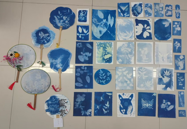 何杨老师《大学美育》公开课是“自然之美”章节中的一堂实践课——蓝晒实践。教学设计结合了课程内容和园林专业的特点,以学生动手为主,教师讲解为辅。学生按照蓝晒的材料要求和制作流程,发挥想象力和创造性,收集素材、设计图案,制作出了一幅幅精美作品。作品需经紫外线照射和流水冲刷方能呈现出不同的蓝色及画面效果,让学生切实体验到大自然赋予的美及动手实践带来的成就感。