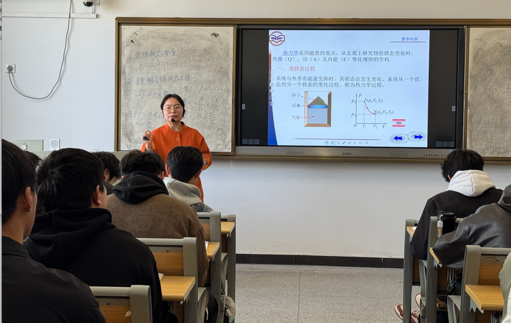 邱茂琴老师结合机械设计与制造专业特点,讲解了“理想气体状态方程与热力学第一定律”,思路清晰、重难点突出,讲解详尽,与学生互动良好。她通过生活实际导入了气体状态参量与平衡态的描述,引出理想气体状态方程;启发学生思考理想气体与实际气体的区别,推导出不同状态变化过程的气体状态方程。详细介绍了热力学过程与热力学系统做功等知识,引导学生进行知识迁移。