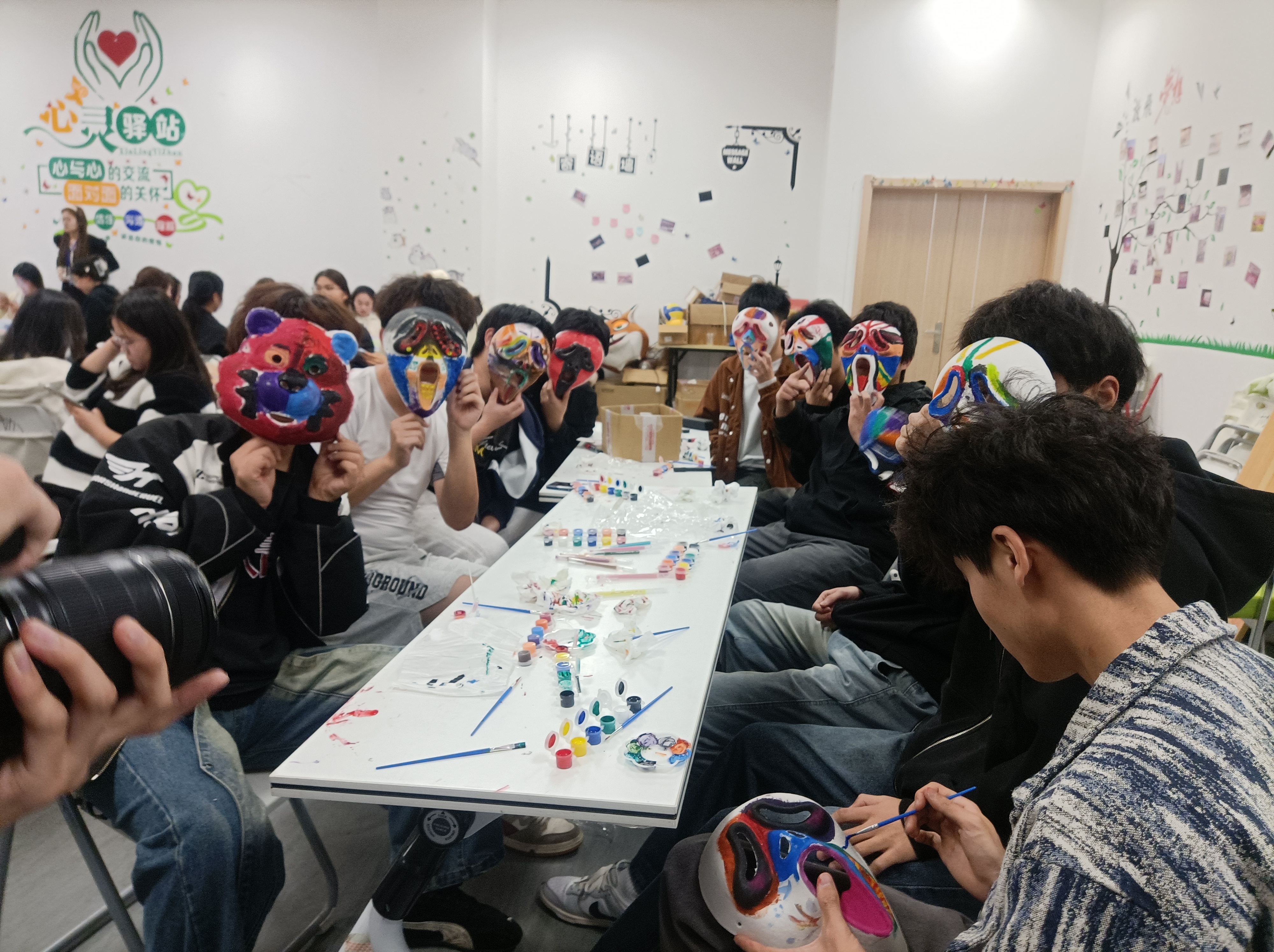 在“面具涂鸦”环节,同学们用画笔在空白面具上自由创作,以色彩和图案表达内心情感。有人用明快的色调描绘喜悦,有人用抽象的线条诉说迷茫,还有人通过暗色碰撞宣泄压力。活动结束后,大家围坐分享创作背后的故事,倾听彼此的心声。心理辅导员王桂年老师点评道:“面具是外在的‘保护壳’,而涂鸦让同学们敢于卸下伪装,直面真实情绪,这正是心理疗愈的关键一步。