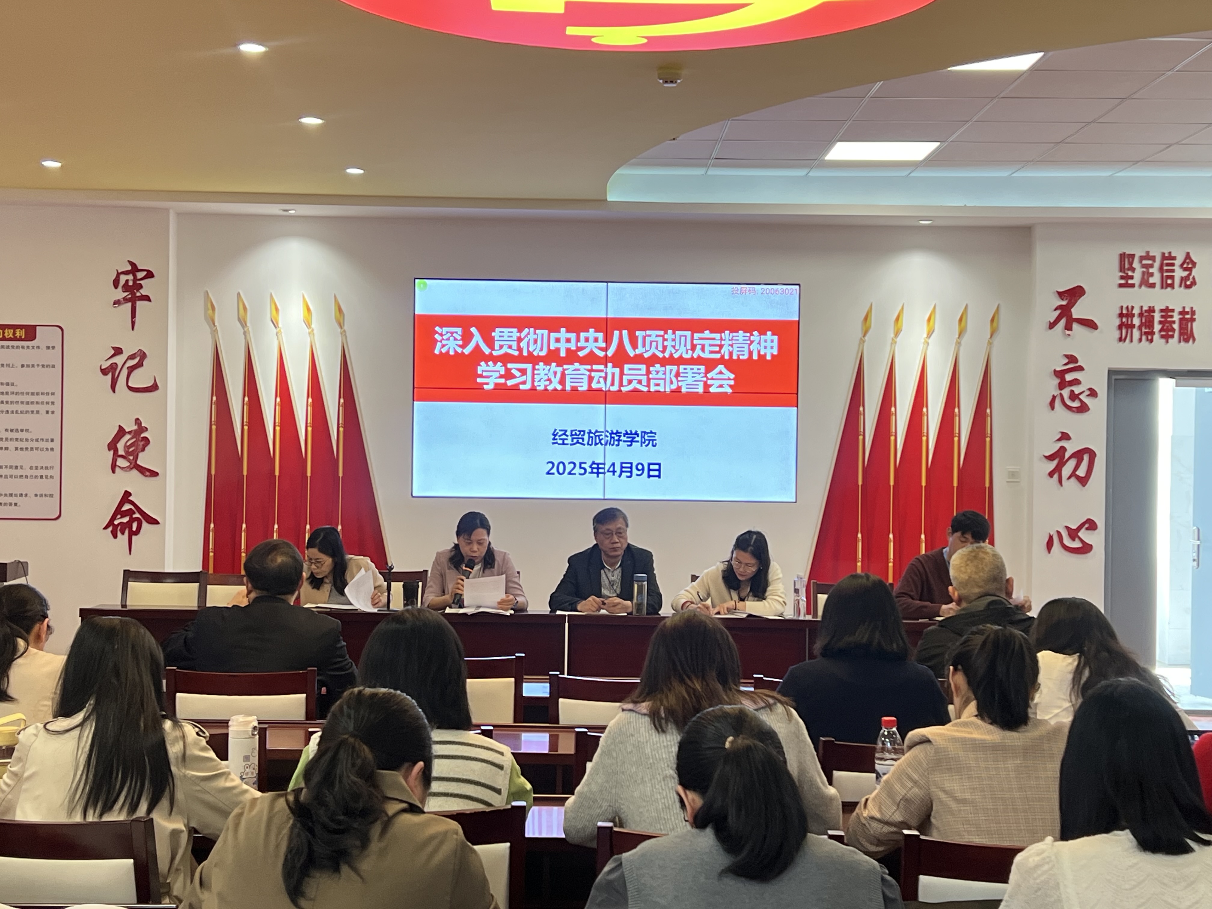 为全面落实中央八项规定精神,强化党风廉政建设,推动全面从严治党向纵深发展,4月9日下午,经贸旅游学院在党性体验馆召开深入贯彻中央八项规定精神学习教育动员部署会。该院党政、全体教职工参会,会议由副院长付晓兰主持。