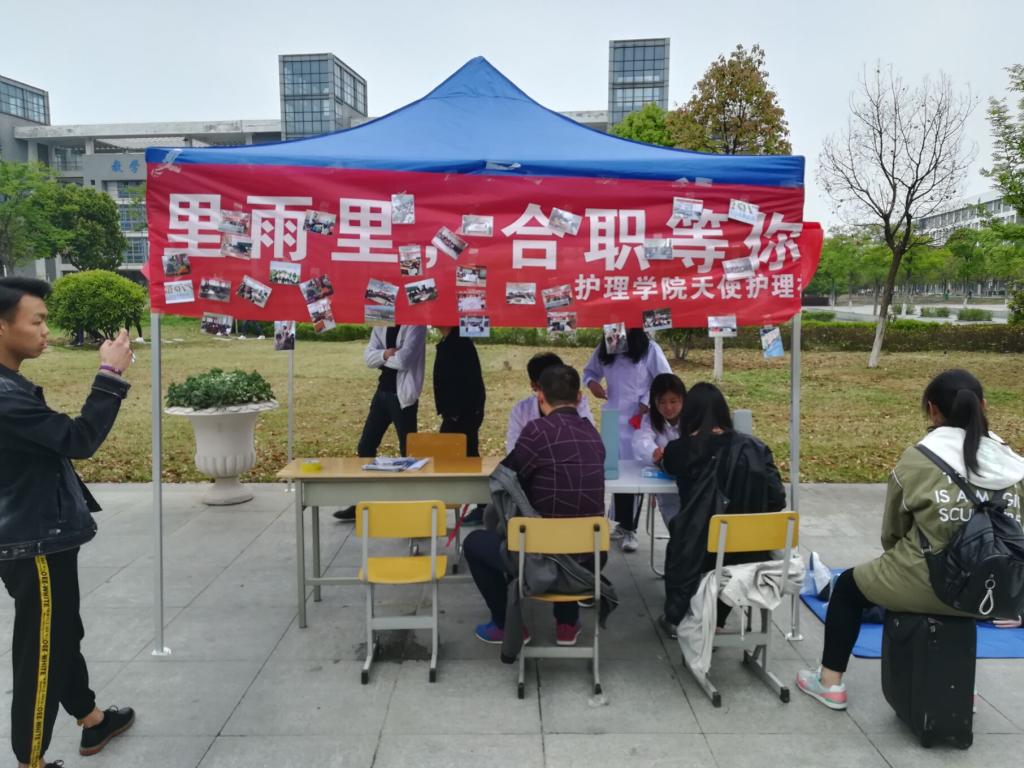 天使护理社作为职业社团,积极普及健康知识,践行救死扶伤理念。社团全体成员经过认真谋划精心组织,开展了一场“以职业为依托,以专业为背景”的社团活动展示活动。活动以“风里雨里 合职等你 千里万里 天使护您”为口号,一是对新老社员的关心,告诉他们不要忘记我们一直都在!二是对参加2018年分类招生考试的学生和家长的祝福,我们相遇在四月,重逢在九月,天使护理社会一直在!