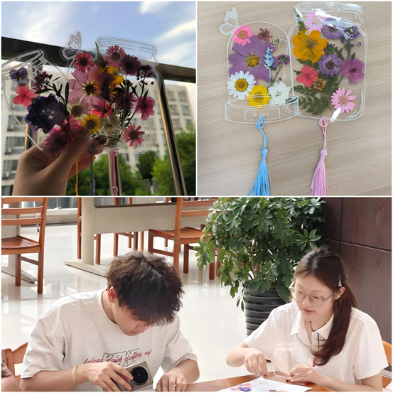 分享环节结束后,一场充满艺术气息的干花书签制作活动将现场氛围推向新的高潮。该院学生会学习部提前准备了各色干花、打孔机、丝带、胶水等材料。同学们化身手工达人,将淡雅的满天星、艳丽的波斯菊、灵动的尤加利叶等,小心翼翼地粘贴在精美的卡纸上,再用透明薄膜细心封装。大家一边制作,一边交流心得,欢声笑语回荡在阅览室中。这些独一无二的干花书签,既是同学们创意的结晶,也成为了此次读书分享会珍贵的纪念。