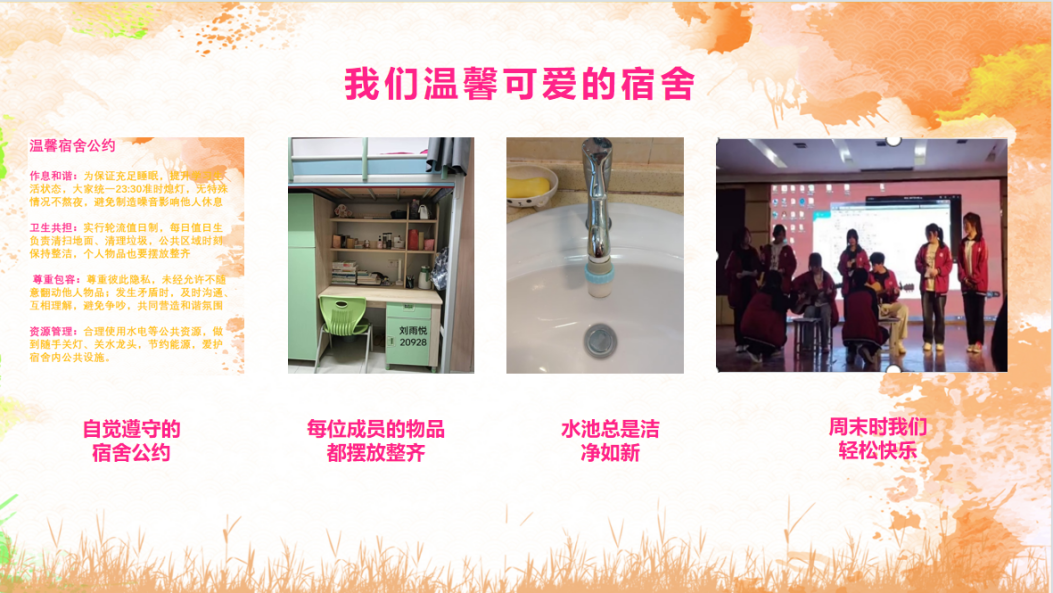活动1:“最美宿舍创建”PPT展示。在“最美宿舍创建”PPT展示中,同学们根据所在宿舍的创建情景,用清晰的画面向读者展示了宿舍成员在物品摆放、卫生清理、参加活动、学习交流等方面一个个充满温暖与感动的场面,展现了同学们青春活泼、团结友爱的良好精神风貌。