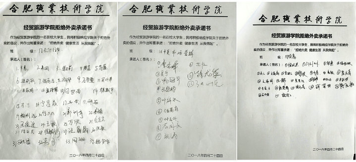 会后,该院党总支副书记吴俊峰倡议各班班长要从自我做起,起到模范带头作用,并在班级中积极向同学宣传,带领大家在拒绝外卖进校园承诺书上签字,用自己的实际行动来证明“拒绝外卖 健康生活 从我做起”。经贸旅游学院将利用多种宣传渠道,倡议和引导经贸旅游学子们切实做到校园文明人人有责,并把此项工作作为校园文明创建的重要内容之一,做好常态化建设。
